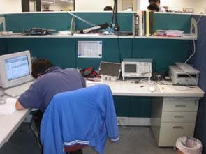 Прежде чем пройти непосредственно в лаборатории и исследовательские отделения, мы прошли через «офисное» помещение. Сотрудники компании, каждый из которых работает над своим сегментом продукции, отлаживая его и приспосабливая под текущие задачи, рассредоточены по полуоткрытым «кубикам».