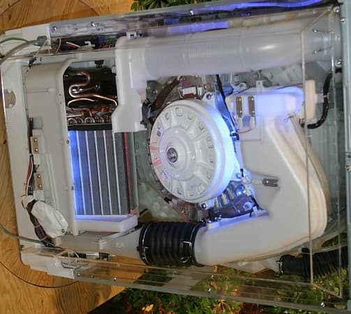 На фотографии модели с прозрачными стенками видно установленный внизу сзади теплообменник теплового насоса. Наклонный барабан повышает удобство в использование (хотя, очевидно, что и увеличивает глубину) и позволяет уменьшить объем используемой воды.