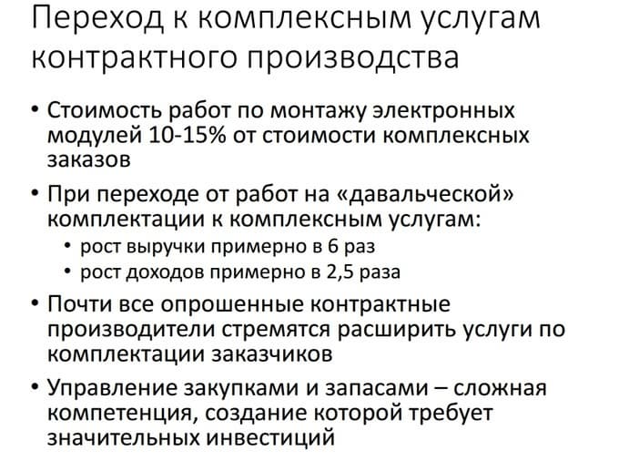 Таким образом, наиболее серьезное влияние на контрактное производство в России, т. е. на цену конечной продукции, оказывают логистика и стоимость компонентов.