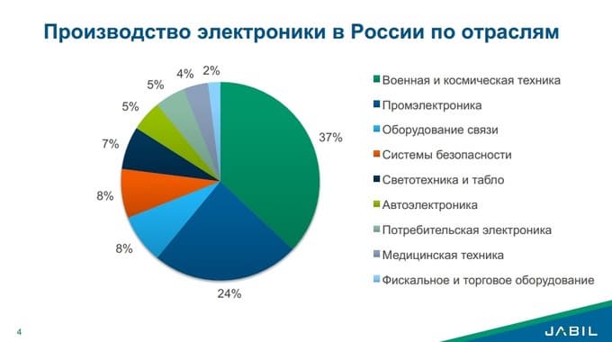 Переходя к состоянию российского рынка, начнем с нескольких цифр. Общий объем рынка электроники в России составляет 34 млрд. долл. Производство электроники — 6 млрд. долл. (18%), контрактное производство — 710 млн. долл. (т. е. всего 2% от общего объема рынка).