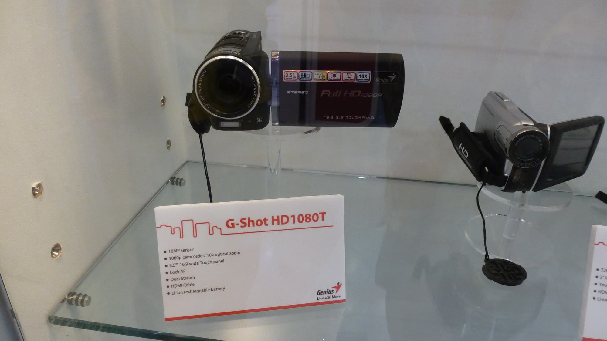 Буквально через несколько минут изучения этих стендов автор словил серьёзный шок: за стеклом Genius-овских витрин обнаружились несколько моделей видеокамер. Нет, не вебкамер, а именно видеокамер. То есть, настоящих камкордеров. С виду, по крайней мере. Правда, как оказалось, это были неработающие образцы.