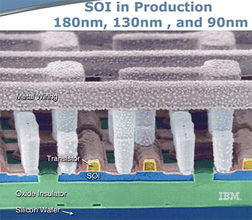 Стойкость SOI -процессоров к утечкам при повышенной температуре кристалла иллюстрируют такие цифры: при температуре 50 градусов Цельсия потребление данных чипов в 1,8 раза меньше, чем у аналогичных кристаллов, изготовленных без применения SOI (0,3 ватт против 0,58 ватт), а при 100 градусах данный показатель составляет 2,25 раз (0,68 ватт у SOI против 1,53 ватт).