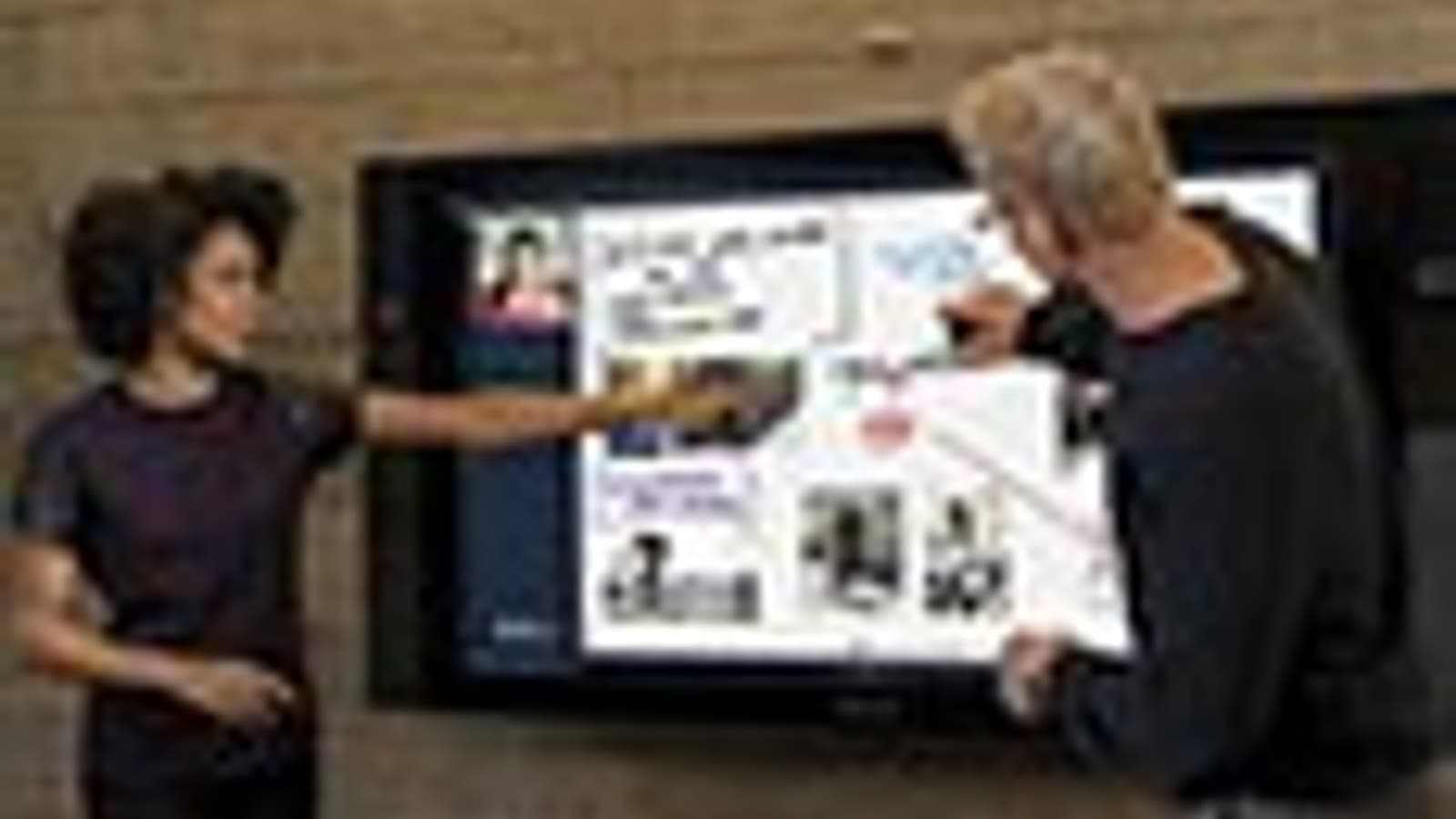 Сейчас Surface вернулся, только теперь в виде огромного экрана на стене. Его основная часть — экран с диагональю 55″ или 84″ и разрешением 4К, на поверхности которого можно писать или рисовать стилусом или пальцем. Кроме того, он обладает всеми современными коммуникационными возможностями: может подключаться к беспроводной сети, обмениваться данными, совершать видеозвонки и пр. Управление во многом завязано на тач. В общем, это умная интерактивная доска с развитыми коммуникационными возможностями.