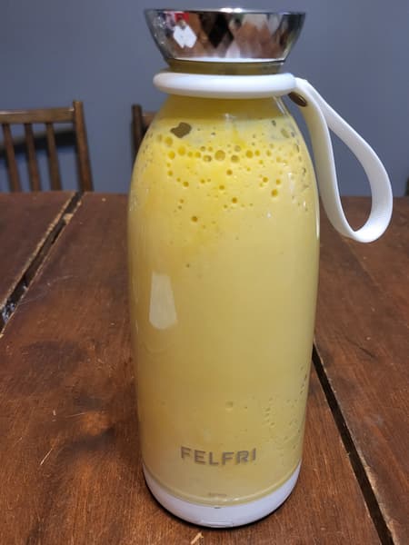 С нашим обязательным помидорным тестом (вроде томаты — вроде бы мягкие овощи, но этот тест всегда самый сложный для блендеров) малыш Felfri справился лишь удовлетворительно, зато остальные испытания — приготовление разных видов смузи и сырного крем-супа — прошел с честью. За все время тестирования нам не пришлось подзаряжать аккумулятор, и 30 взбиваний мы не проводили. Заряжается прибор на док-станции с USB-портом.