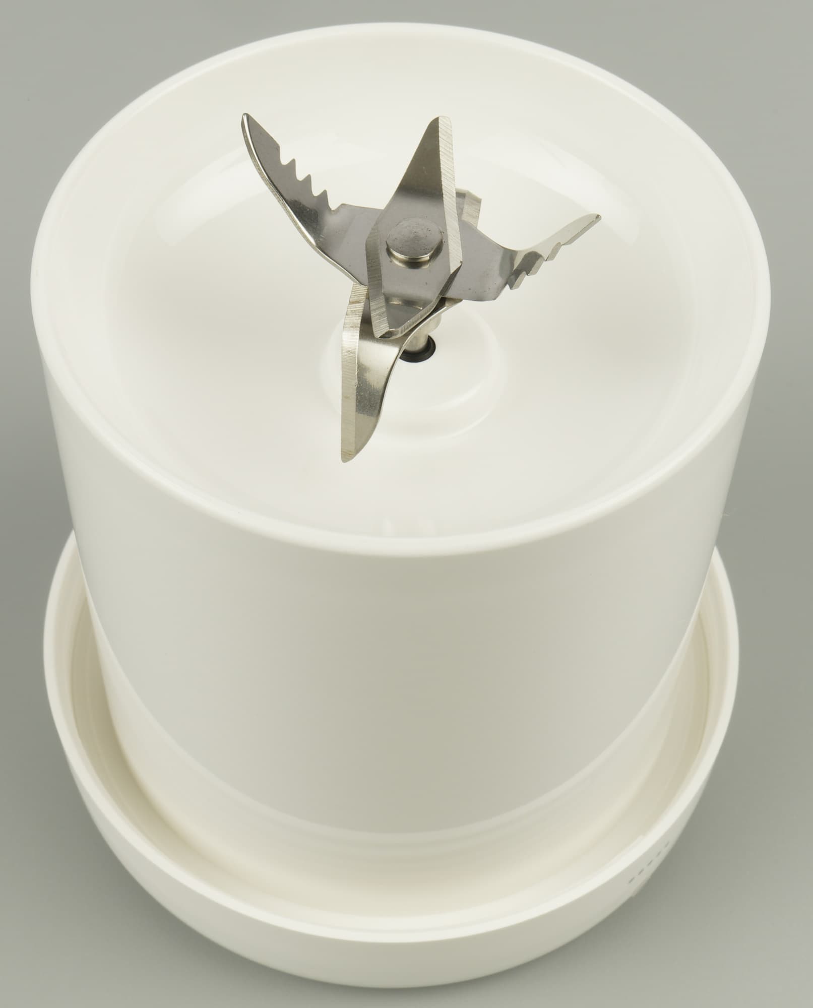 Если в предыдущем блендере этого обзора мотор и ножи располагаются в дне прибора (и его можно заменить на простое), то здесь мотор и аккумулятор находятся в крышке. С измельчением томатов блендер справился играючи (наш обязательный сложный тест, который мало какой прибор проходит на «отлично»). Мы приготовили классический смузи с замороженными ягодами (проверять так проверять!), бананом и овсянкой — отлично. Смузи без заморозки, молочный коктейль и детское питание — тоже замечательно: полный 40-секундный цикл довел содержимое стакана с порошковой детской смесью и молоком до гомогенности. Уровень шума у прибора средний: около 78 дБА. Наш вывод: хороший буквально карманный помощник в дорогу, да и на кухне пригодится для небольших задач.