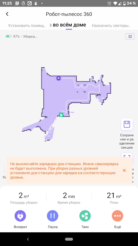 Если в процессе работы заряд аккумулятора падает до минимальных 20%, робот прерывает уборку и отправляется на базу. После того, как батарея зарядится полностью, задание будет возобновлено с той точки, где оно приостановилось. Но если к этому моменту начал действовать режим «Не беспокоить», уборка начнется только следующим утром.