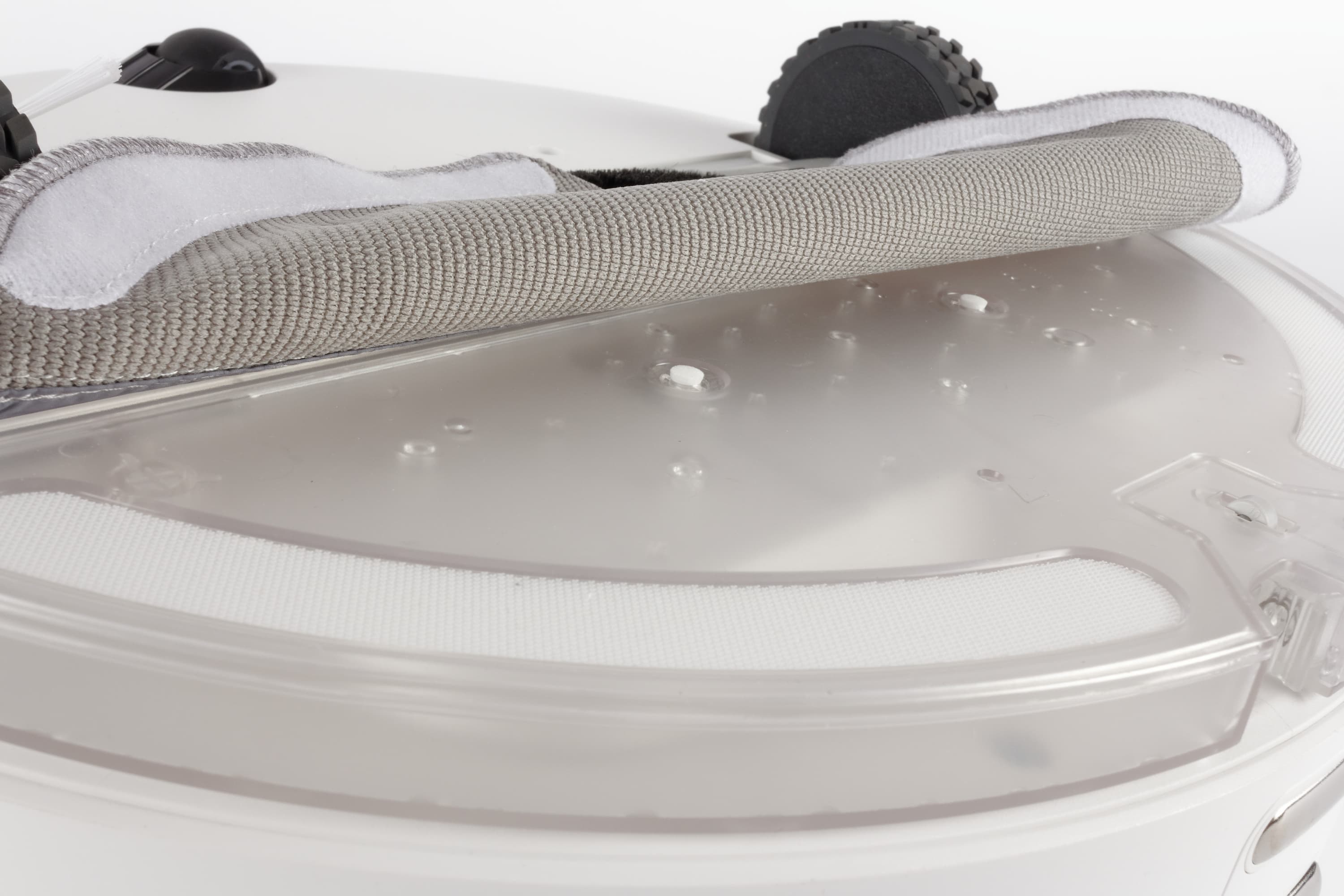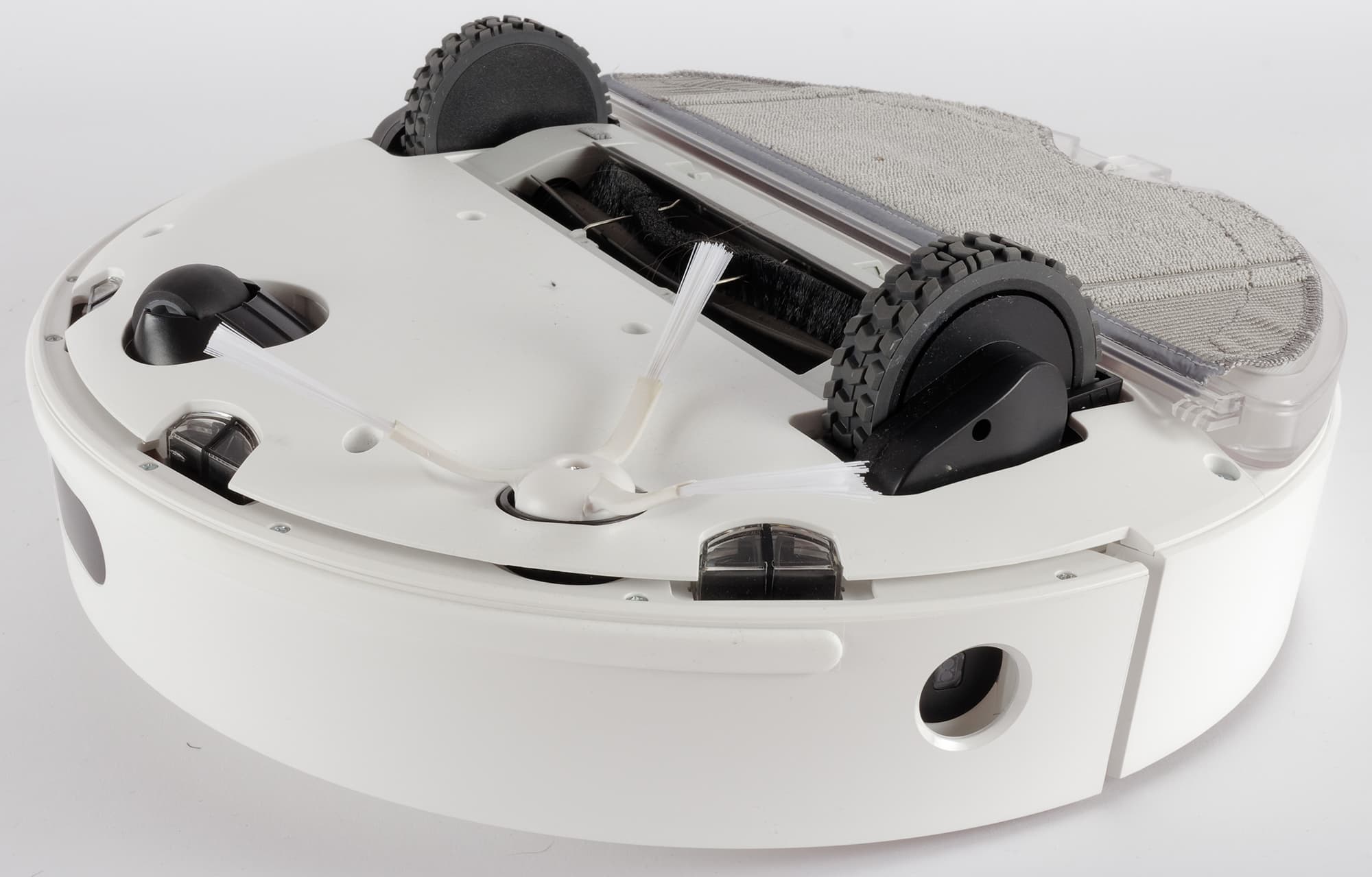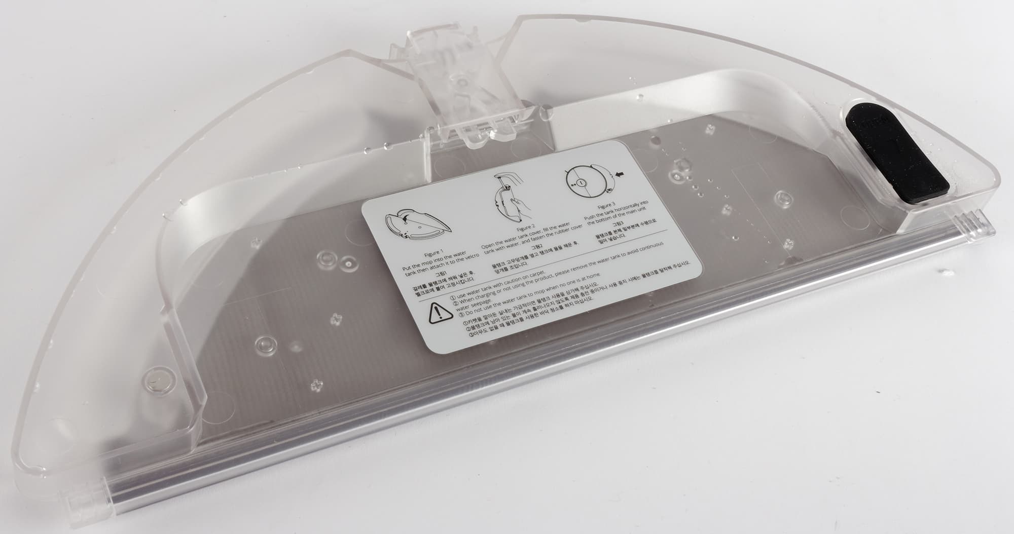 Заднюю половину нижней панели занимает съемный модуль для влажной уборки, состоящий из бака для воды и мягкой тряпки. На «корме» пылесоса выступают два металлических контакта, предназначенных для зарядки прибора.