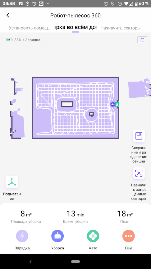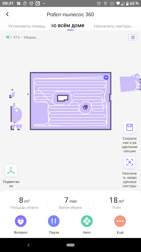 Можно приступать к первой уборке. Через пару минут после запуска приложение рисует весьма точную карту помещения. Стены и крупная мебель изображаются на карте белым, доступная для подметания площадь показывается сиреневым. Белая линия отмечает пройденный роботом путь.