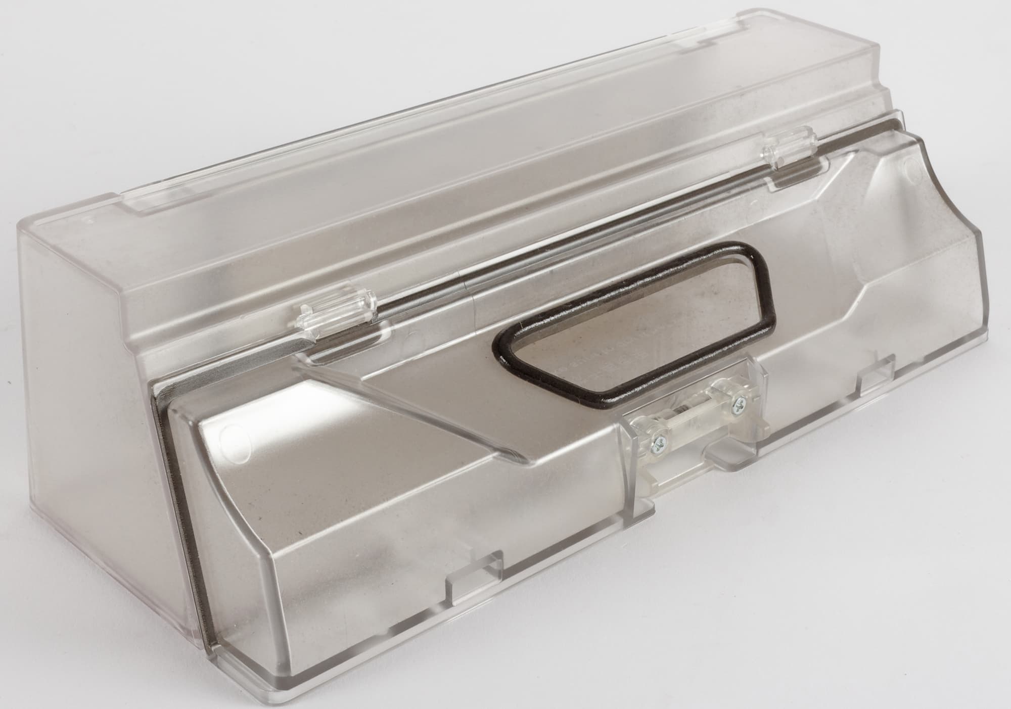 Мусоросборник выполнен из полупрозрачного пластика серого цвета. Его приемное отверстие закрыто клапаном, не позволяющим мусору высыпаться.