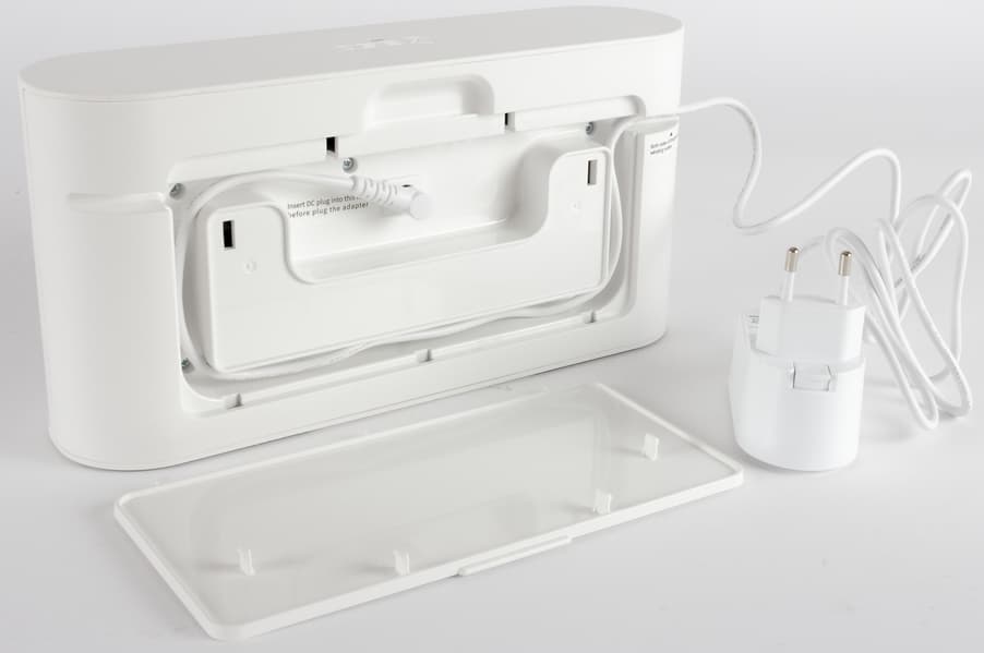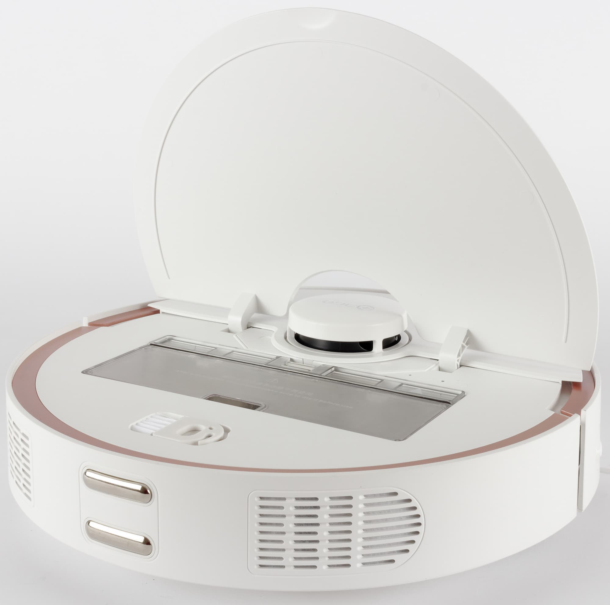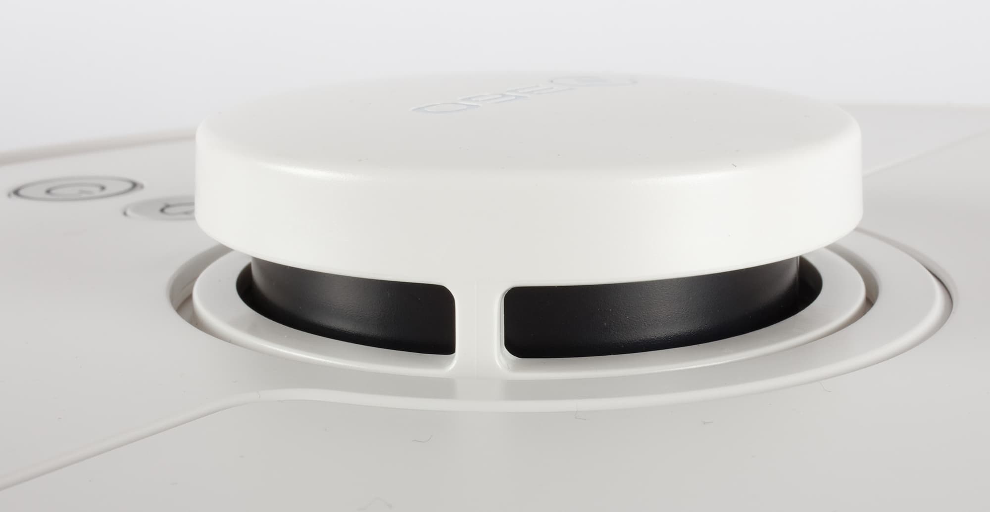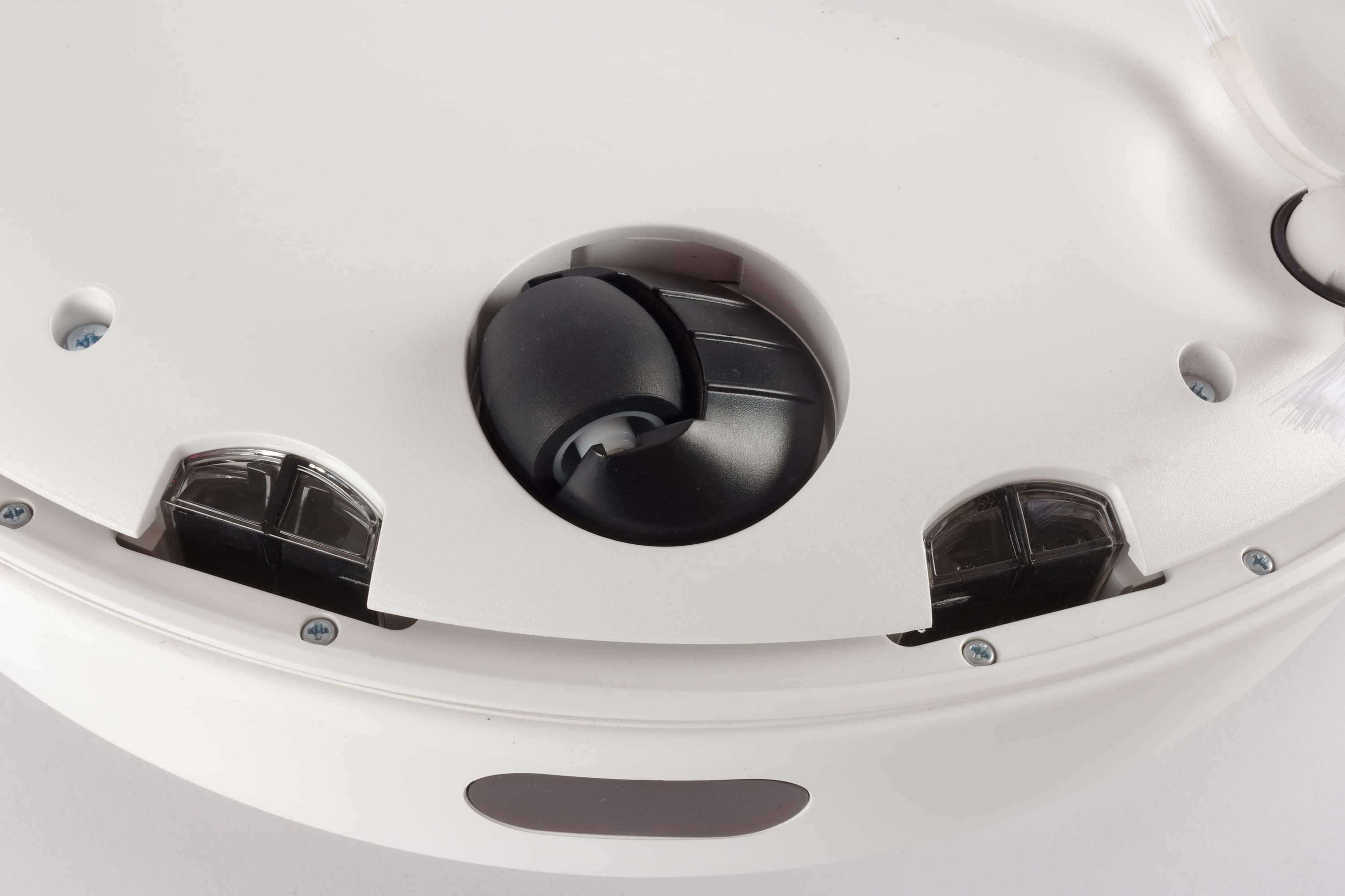 База устройства выполнена из такого же белого пластика. На ее лицевой стороне мы видим окно, закрытое ИК-прозрачным стеклом: под ним расположены датчики, облегчающие роботу поиск зарядной станции. На верхней стороне имеется окошко индикатора зарядки.
