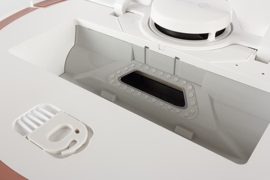 Рядом с нишей контейнера для мусора — гнездо для хранения щеточки с лезвием, которой чистят фильтр и срезают неизбежные нитки и волосы, наматывающиеся на моторную щетку. Очень удобное решение: аксессуар для чистки всегда под рукой. В правой части корпуса под крышкой два отверстия: в одном из них размещен индикатор сетевой активности, мигающий в процессе сопряжения, в другом скрывается кнопка сброса настроек робота.