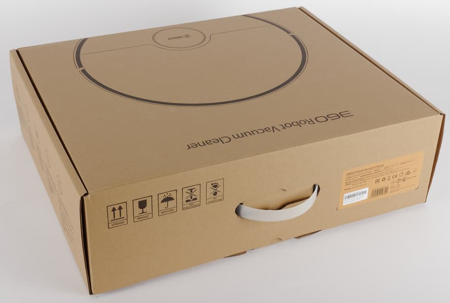 Упаковка устройства предельно проста и лаконична: коричневая картонная коробка со схематическим изображением пылесоса и его названием. То, что в коробке содержится именно модель S7, мы узнаем, только всмотревшись в мелкий текст наклейки на верхней грани коробки, рядом с пластиковой ручкой.