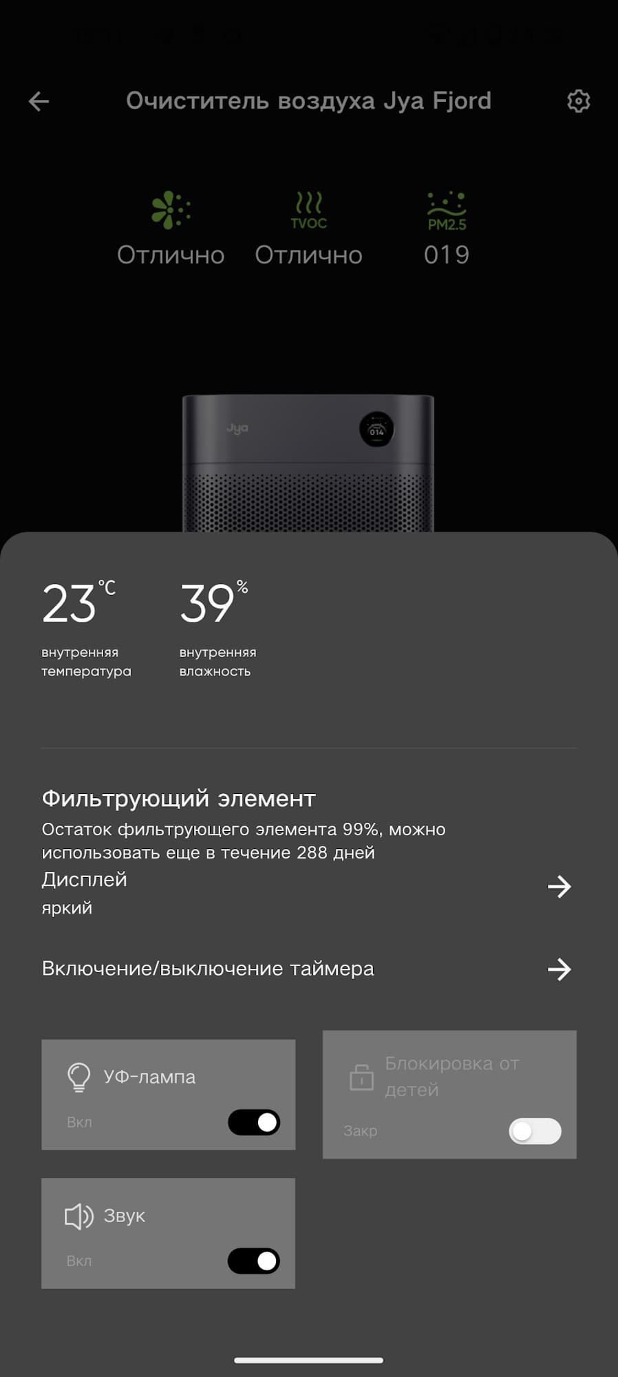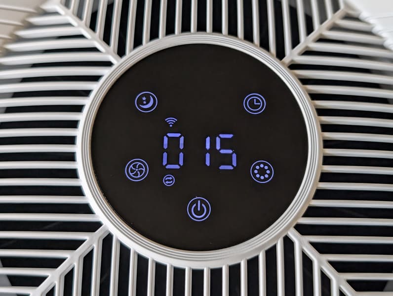Управление прибором элементарное электронное: клавиши на корпусе переключают скорость работы, включают автоматический или ночной бесшумный режим, позволяют выбрать автоотключение по таймеру от 1 до 19 часов. На дисплее схематически отображается уровень загрязненности воздуха, но точных показателей нет. Также доступно управление с пульта ДУ и через приложение, но оно работает в ограниченном режиме и на момент публикации обзора на позволяло сделать очиститель воздуха полноценным элементом умного дома.