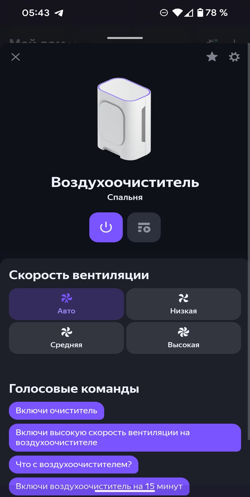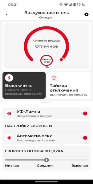 Очиститель воздуха может управляться удаленно со смартфона через приложение приложение Ready for Sky и совместим с голосовыми помощниками Алиса и Маруся. В приложении отображается качество воздуха, можно включить и выключить прибор и встроенную УФ-лампу, переключать режимы работы вентилятора — активировать или отключить автоматический режим, переключать скорости. Алиса тоже управляет работой вентилятора, переводит прибор в режим сна и активирует таймер автоотключения. Голосовых команд достаточно, помощник и прибор корректно работают в паре.