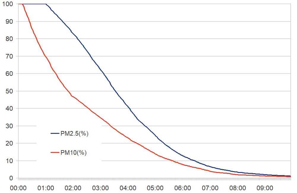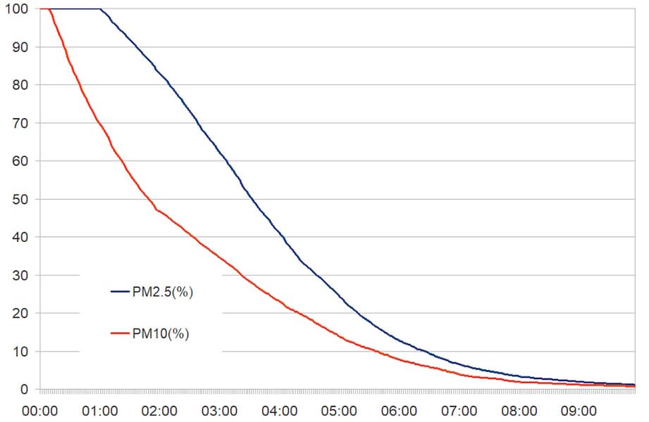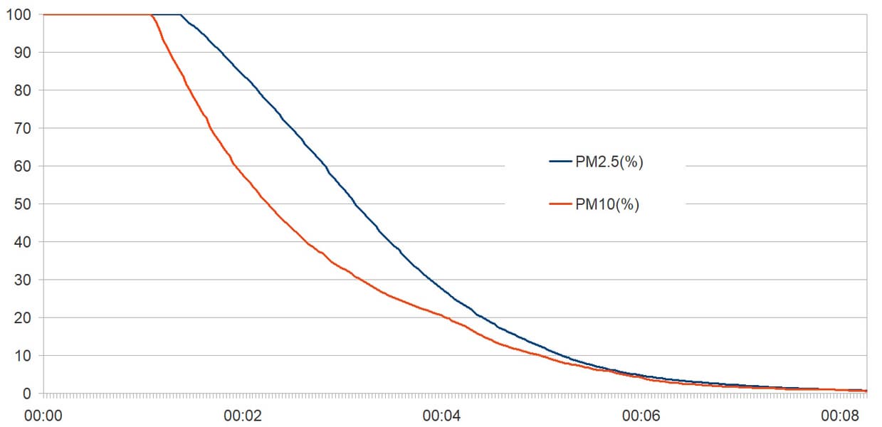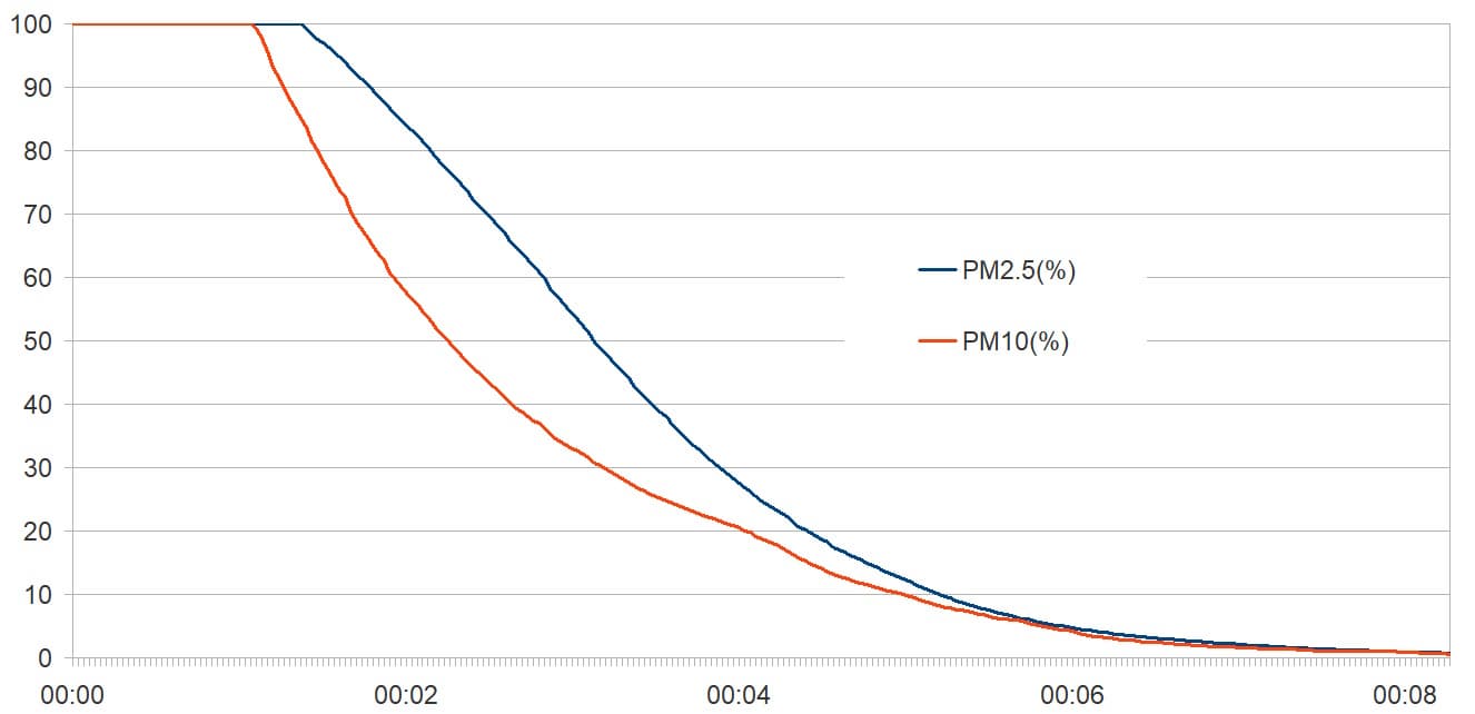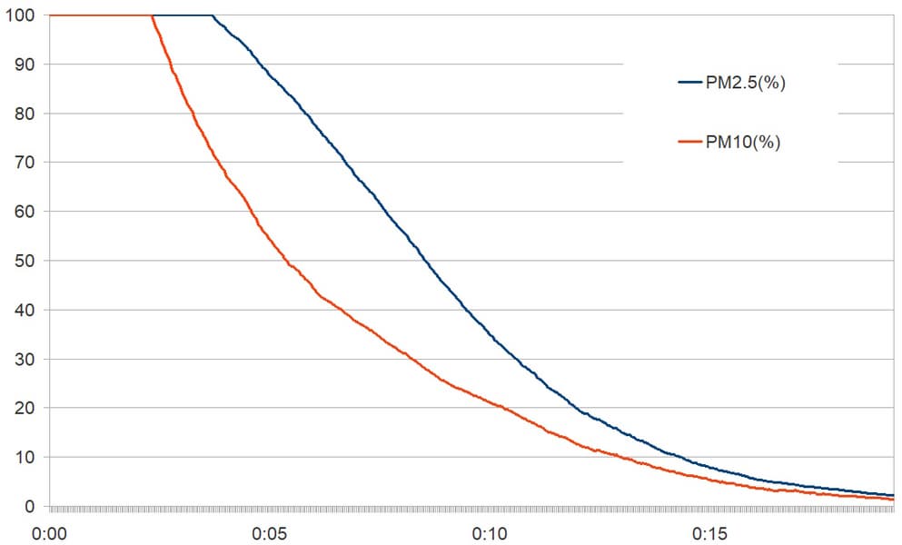 На самой высокой скорости очиститель воздуха снизил загрязнение PM2.5 до 50% от максимума за 8 минут 30 секунд. До приемлемого уровня в 30 мкг/м³ уровень взвешенных частиц упал через 18 минут 16 секунд (как обычно, в качестве загрязнения использовали дым из дымогенератора). Прибору потребовалось полчаса работы на максимальной мощности, чтобы количество PM2.5 и PM10 снизилось до вполне безопасных 2,7 и 4,2 мкг/м³ соответственно. При естественном оседании частиц загрязнение воздуха оставалось бы на крайне опасном уровне, превышая максимальный порог чувствительности датчика: 999 мкг/м³ и 1999 мкг/м³. Результаты не самые высокие, но для заявленной площади этот компактный воздухоочиститель вполне подойдет.