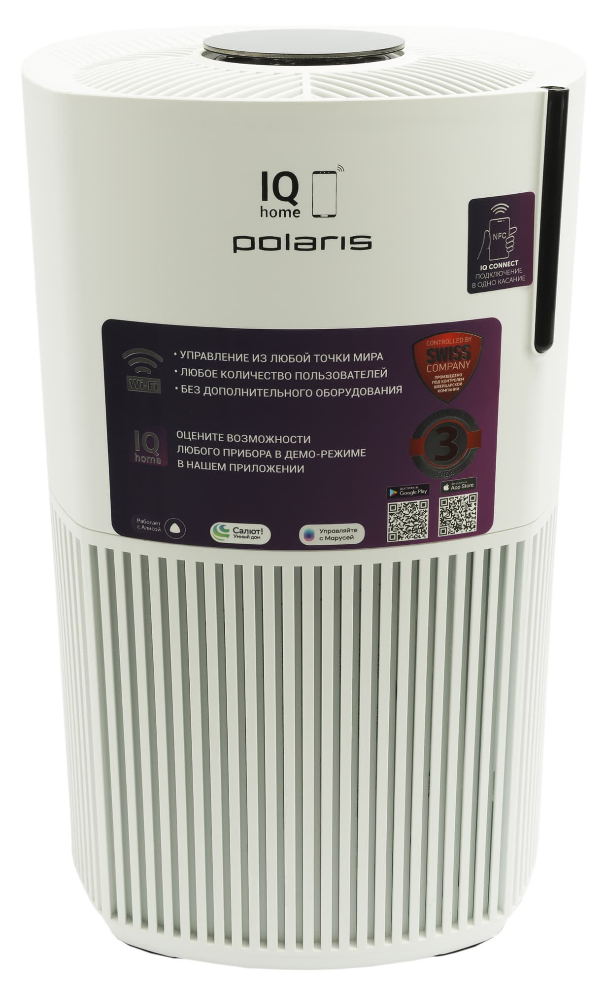 Этот прибор предназначен для очистки воздуха в помещениях площадью до 20 м². Управлять им можно по Wi-Fi через приложение Polaris IQ Home или же с помощью панели управления в верхней части прибора. Предусмотрены блокировка от детей, ночной режим, есть функция ионизации воздуха и таймер автоотключения от 1 до 12 часов. Скорость работы вентилятора, разумеется, можно выбрать. Есть индикатор замены фильтра (он рассчитан на 3000 часов работы). Все эти возможности дублируются в мобильном приложении. По умолчанию воздухоочиститель включается в автоматическом режиме