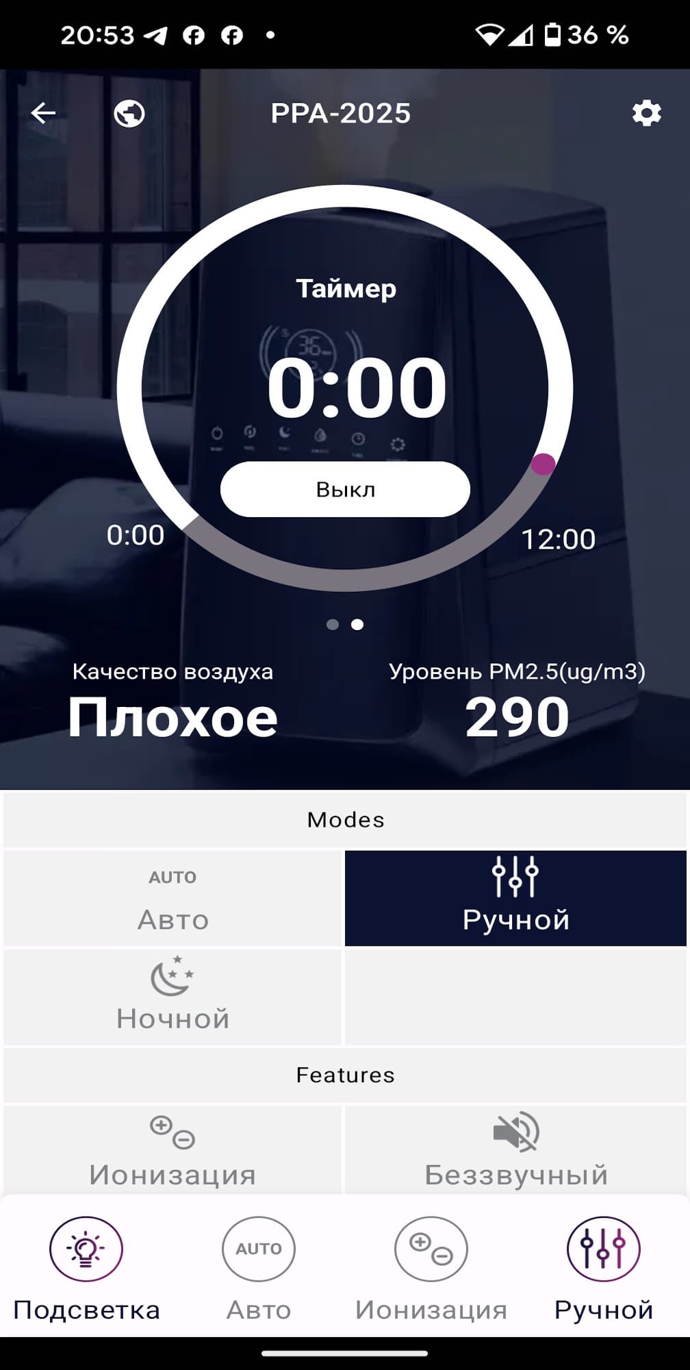 Прибором можно управлять не только с панели на корпусе, но и в двух приложениях — официальном производителя и Smart Life — Smart Living (Volcano Technology). Первое позволяет настроить работу прибора по расписанию, узнать ресурс фильтра, включить или выключить звук, УФ-лампу, блокировку от детей. Скорость работы можно менять и в приложении, и на панели управления. Интерфейс приложения нам не очень понравился: много вопросов к переводу. Зато Smart Life не только позволяет управлять воздухоочистителем со смартфона, но и легко интегрирует его в систему умного дома.