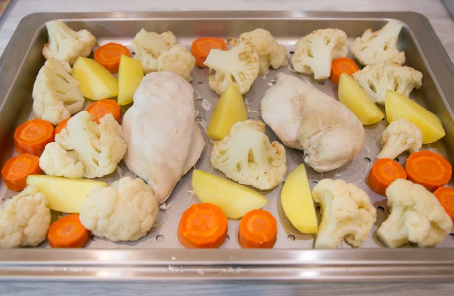 Приготовление пищи в духовке с паром или на пару удобно для тех, кто придерживается определенной диеты, но особенно ценно, что пар можно комбинировать с другими режимами. Но мы попробовали и режим пароварки: в режиме длительного приготовления на пару́ при 110 °C на 30 минут готовили курицу с овощами. Этого времени хватило, чтобы все продукты на противне полноценно приготовились и остались сочными.