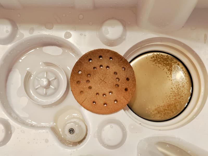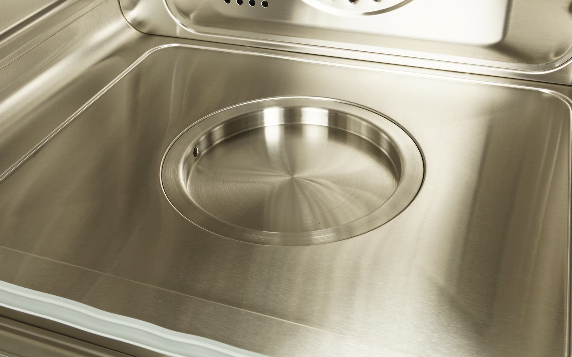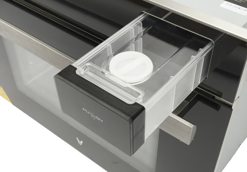 Вода заливается через специальный отсек рядом с панелью управления, а в нижней части камеры расположен круглый плоский резервуар для воды, куда она поступает и откуда испаряется. Заметим, что у духовки по этой причине нет нижнего нагрева — только верхний и конвекция, но, как мы выяснили, выпекая хлеб, можно обойтись без нижнего нагрева, правда, путем экспериментов с режимами.