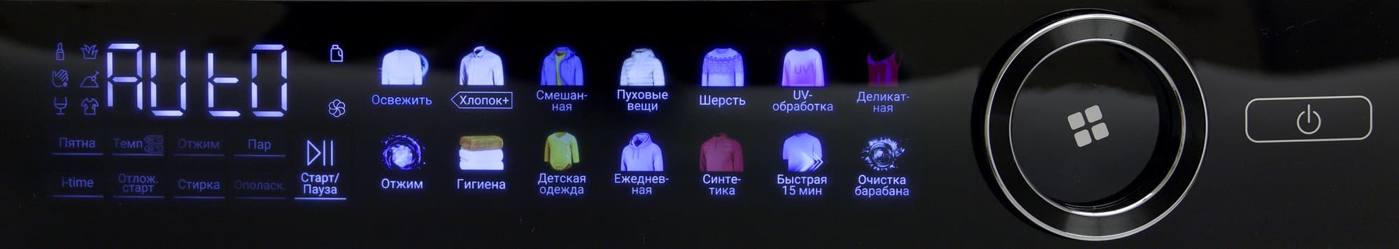 - Программы: 14 автоматических программ: Деликатные вещи, Освежить (Пар), Синтетика, Смешанные ткани, Деликатная, Шерсть, Детские вещи, Ежедневная стирка, Экспресс-стирка, Полоскание, Отжим, Самоочистка, Гигиена, Хлопок+, Смешанная, Пуховые вещи, Очистка барабана, UV-обработка