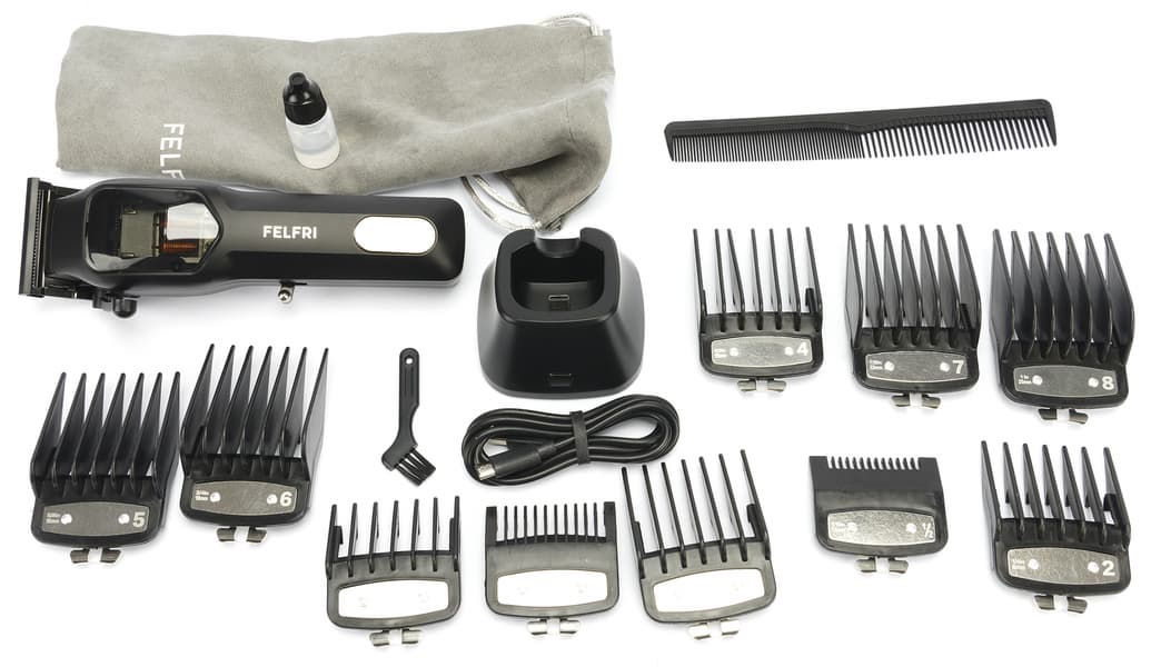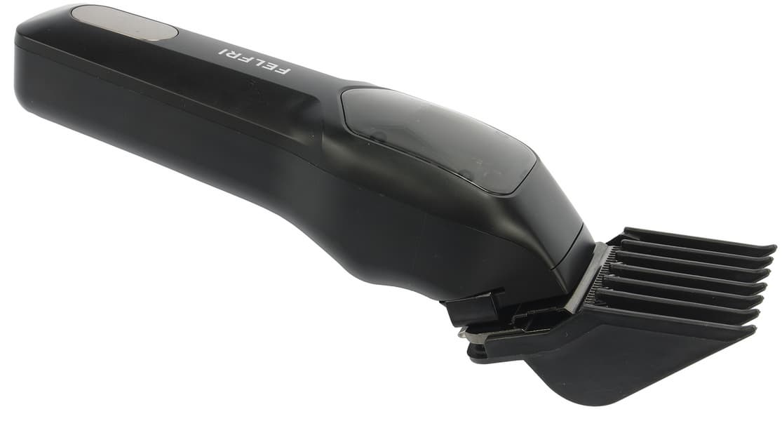 У машинки единственный орган управление — включатель / выключатель, и скорость, соответственно, одна. Сам приборчик очень легкий — 130 г, и компактный, в комплекте 5 насадок и 5 гребней. Насадка длиной 12 мм немного дергала волосы и тормозила, зато на 9, 6 и 3 мм работали почти безупречно, триммер без насадок показал и вовсе отличный результат.