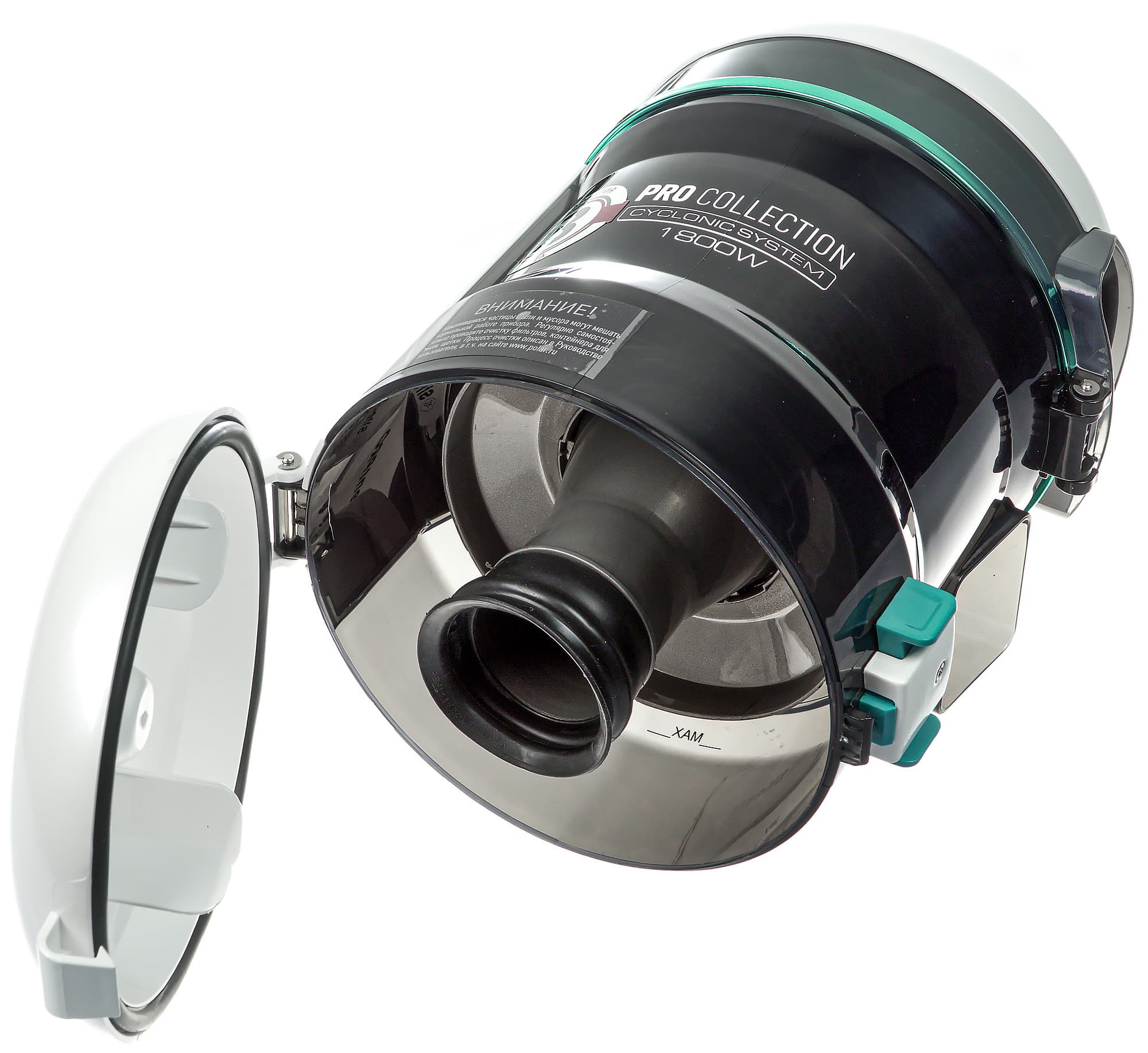Компактный (256×325×365 мм) и легкий (4,8 кг) циклонический пылесос с контейнером объемом 1,7 литра удивил необычным креплением пылесборника к корпусу. Верхняя часть контейнера фиксируется на корпусе пылесоса при помощи откидной ручки. Чтобы снять резервуар, надо нажать на круглую кнопку. Конструкция показалась нам очень продуманной: можно и переносить пылесборник, и открывать его, не испачкав рук, а установка на место и вынимания его из корпуса не составляют ни малейшего труда. Плохо только, что контейнер выполнен из темного пластика, и это не дает видеть уровень заполненности.