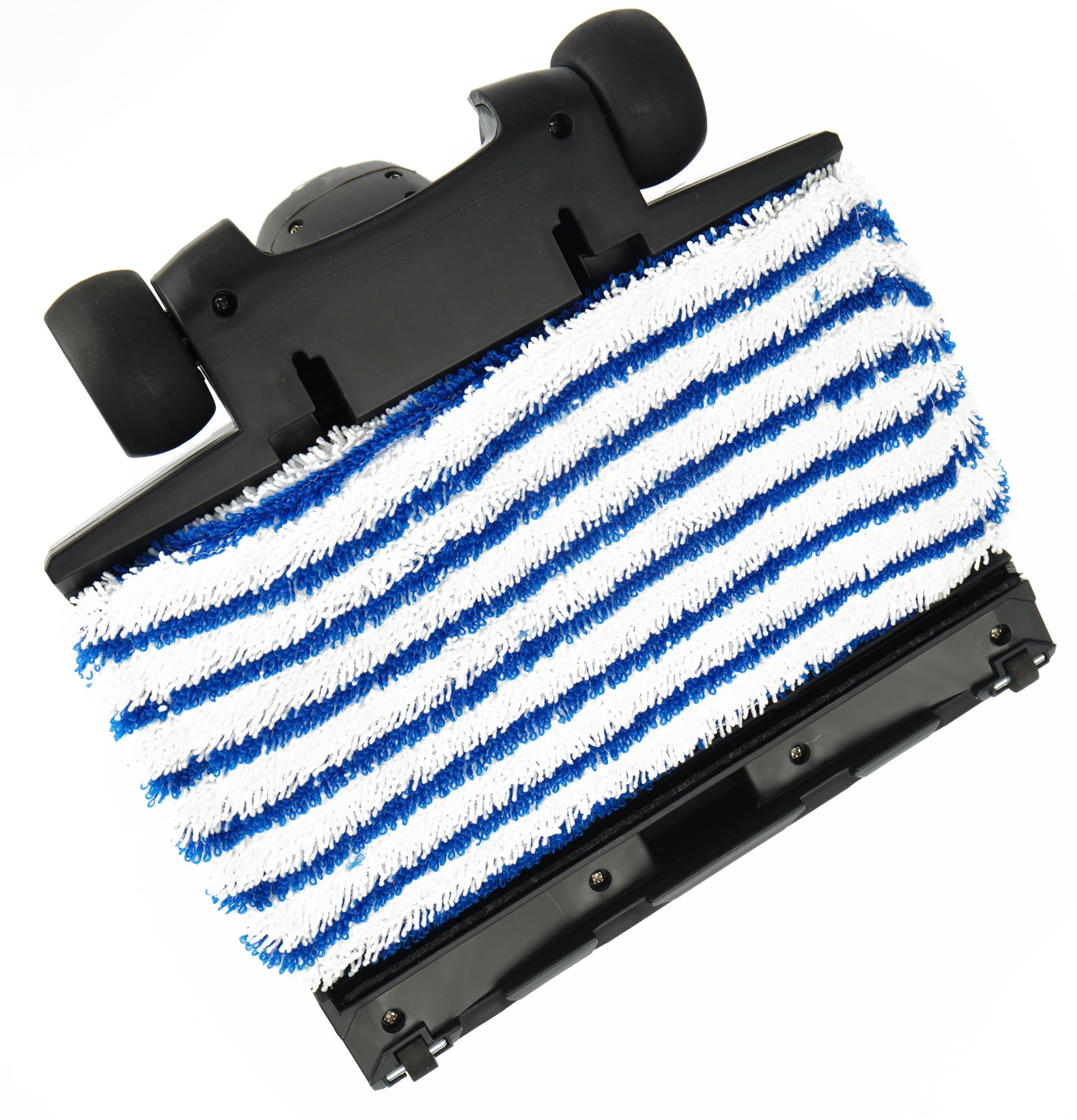 Насадки парогенератора — струйная, плоская для чистки швов между плиткой и круглая универсальная. К насадке для пола крепится тряпка для отпаривания и мытья пола и при необходимости рамка для чистки ковровых покрытий. Эти аксессуары съемные.