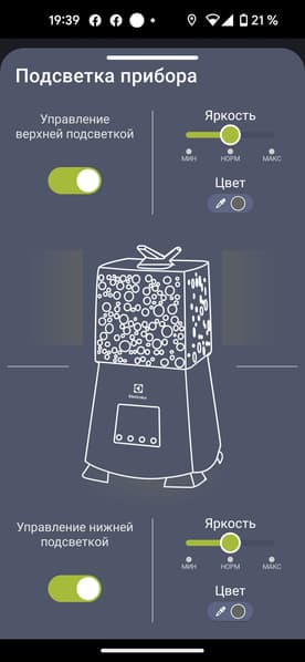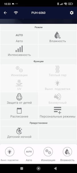 Увлажнитель может работать в автоматическом режиме, ориентируясь на комфортный уровень влажности. Управлять прибором можно посредством сенсорной панели, пульта дистанционного управления, мобильного приложения (там можно настроить параметры более гибко, задать расписание работы) и голосовых помощников. Через приложение можно задать целевую влажность (от 30% до 90%), время отключения (до 12 часов), включить и выключить режимы: авто, ночной, ароматизации, УФ-стерилизации воды и ионизации.