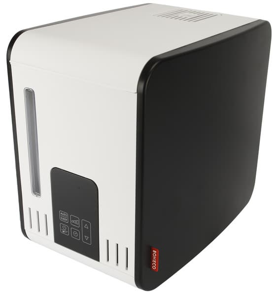Отличительные особенности прибора — строгий стильный дизайн, продуманное сенсорное управление и функция теплого пара, позволяющая быстро повысить влажность в помещении. Бак для воды оснащен деминерализующим картриджем, что позволяет использовать даже водопроводную воду (хотя, конечно, оптимально — дистиллированную или доочищенную, фильтрованную). Струю пара можно направлять двумя вращающимися соплами до 180° — удобно.