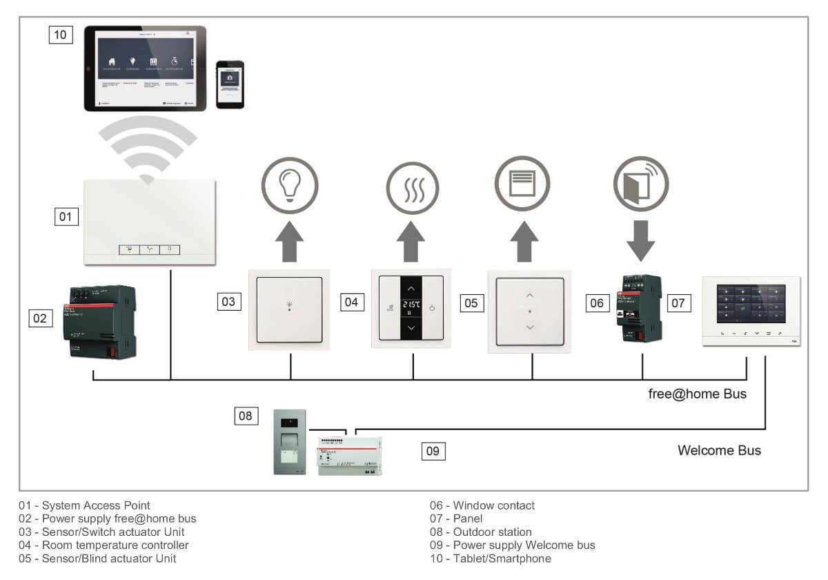 ABB free@home использует проводную шину для обмена данными между элементами системы. Среднее напряжение в ней составляет 24 В. Могут использоваться аналогичные KNX кабели, включая JY(St)Y2x2x0,8 VDE0815, YCYM2x2x0,8, A2Y(L)2Y и A-2YF(L)2Y. Сама шина двухпроводная, но рекомендуется прокладка четырехжильного кабеля. Для непосредственного подключения шины на всех устройствах установлены удобные специальные разъемы для монтажа без использования инструментов.