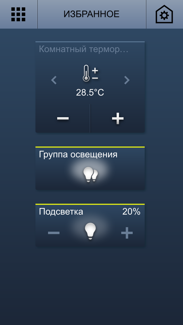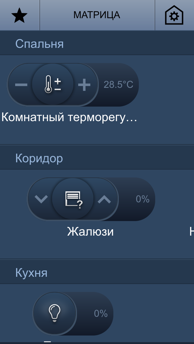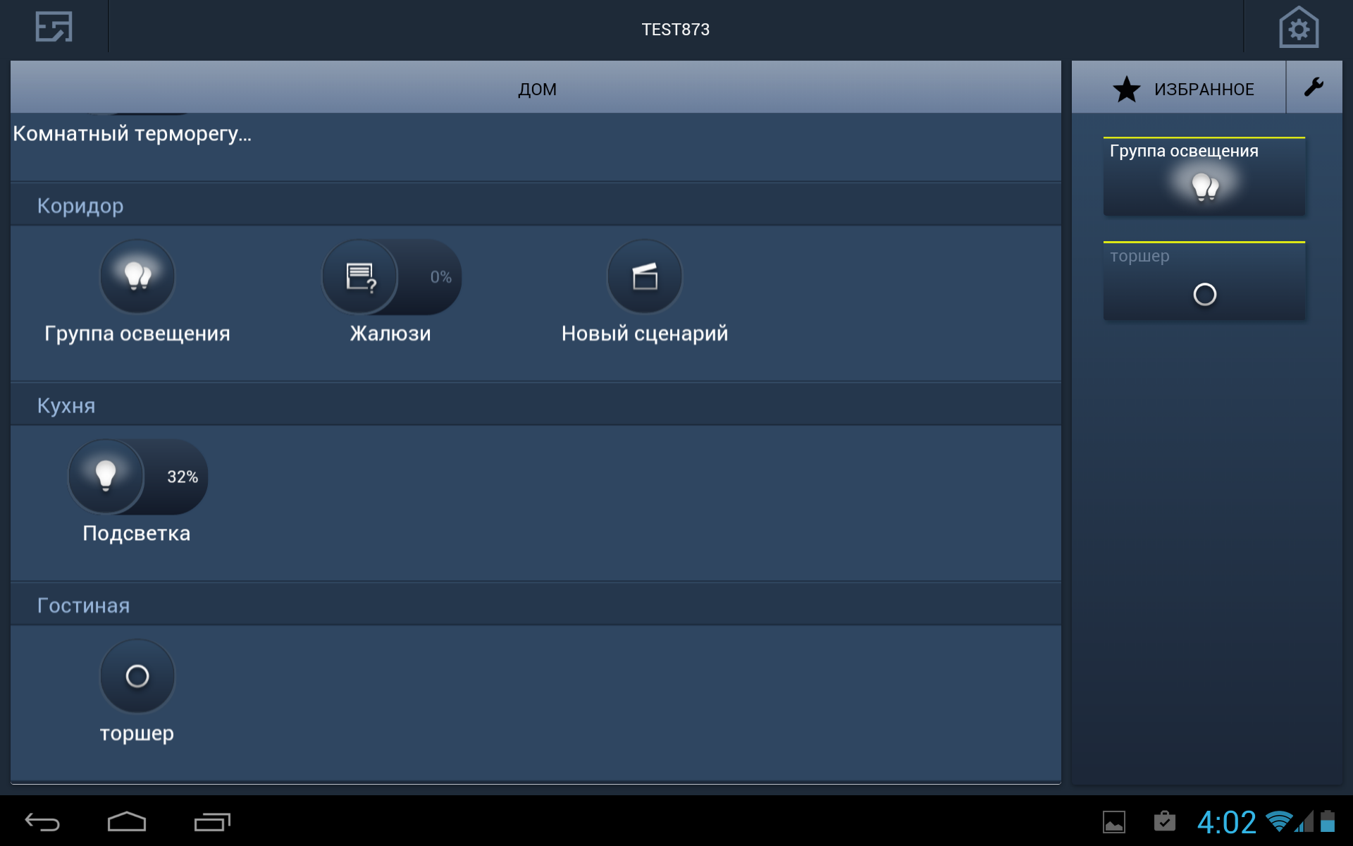 Есть возможность переключения режима отображения сиситемы из схемы в список, сгруппированный по комнатам, но не этажам. Для наиболее часто используемых устройств есть специальное меню «Избранное», индивидуальное для каждого пользователя системы.