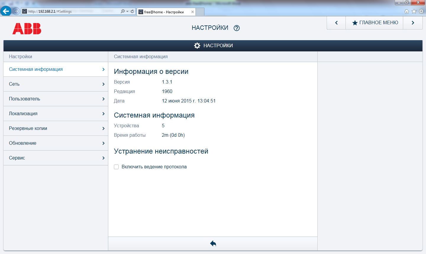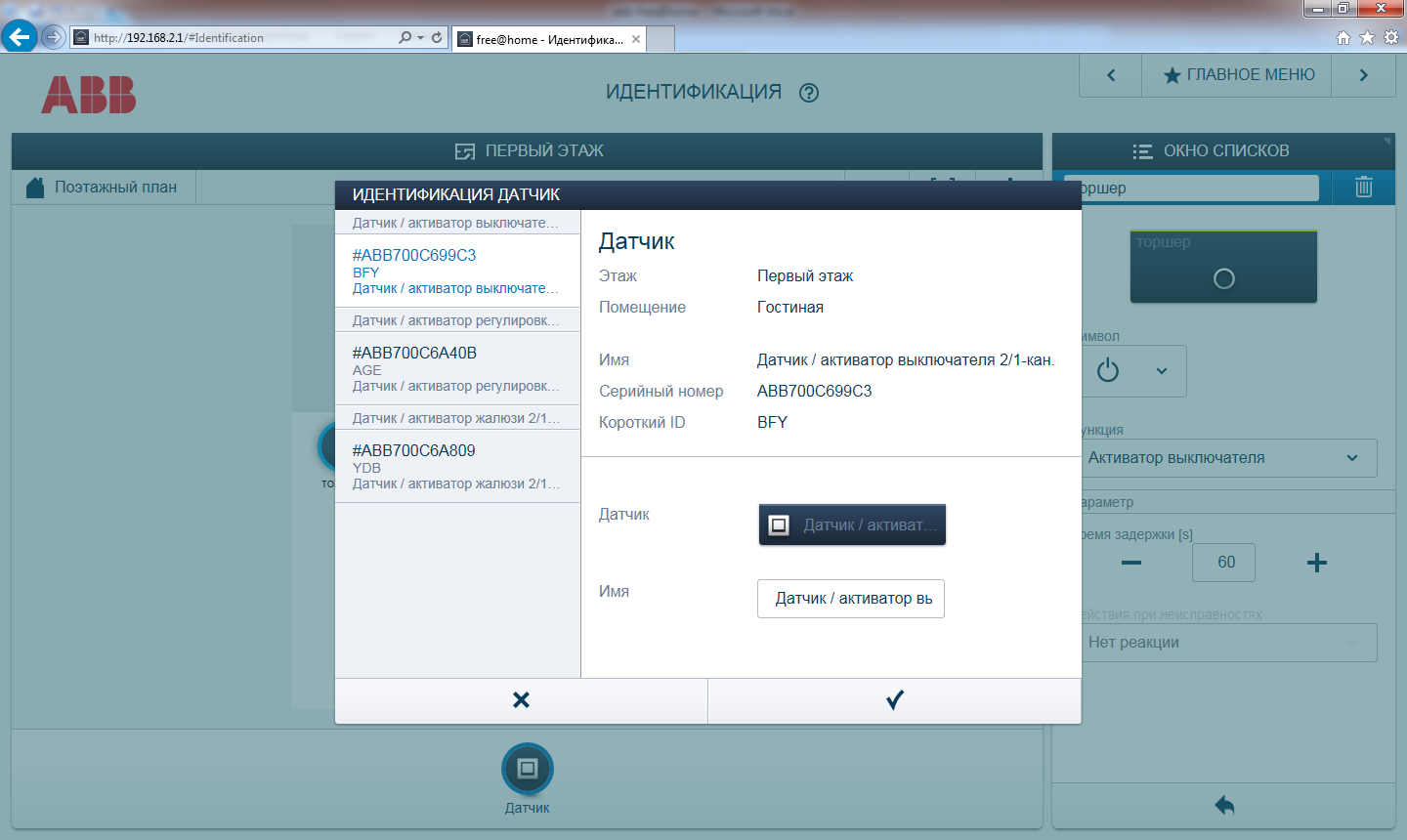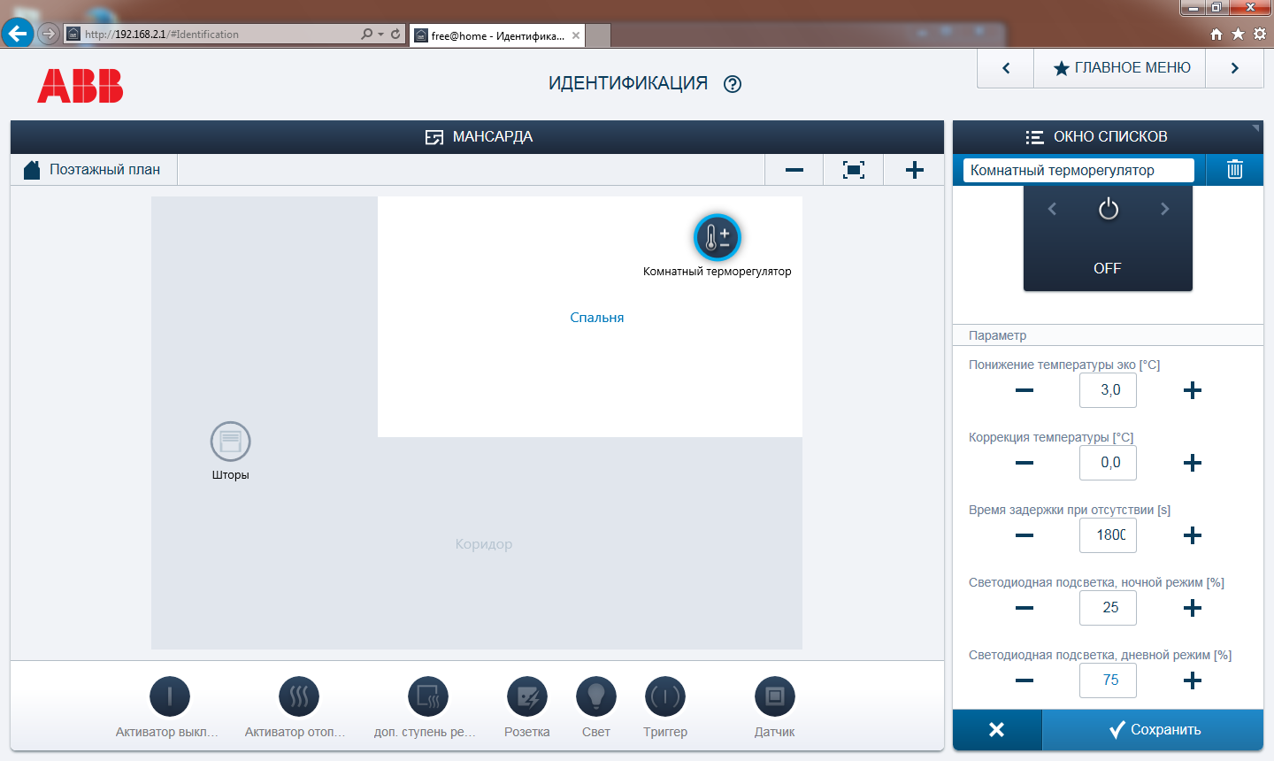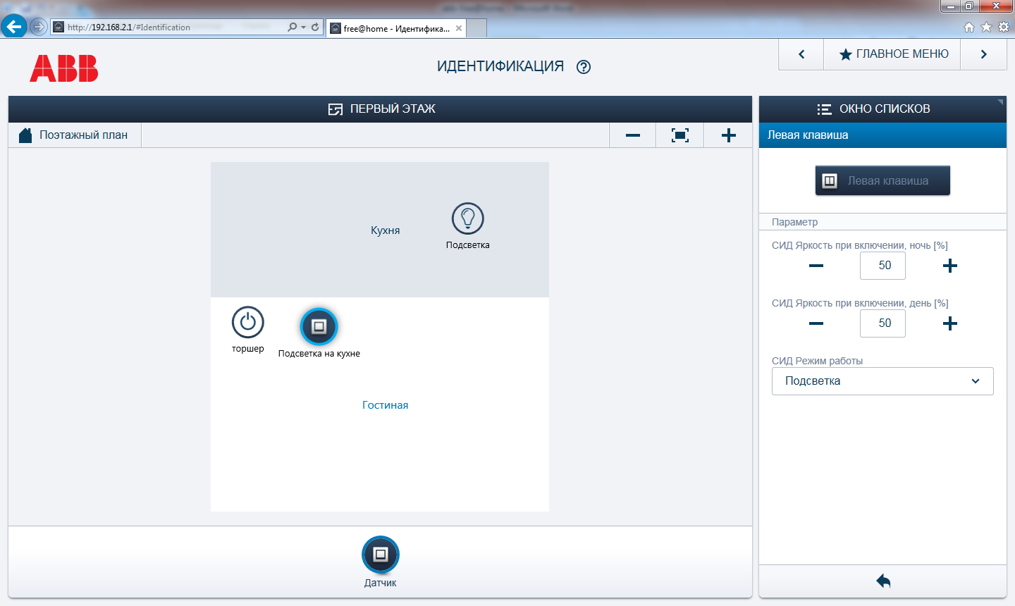 В главном меню веб-интерфейса есть еще две кнопки — «Конфигурация устройства» и «Настройки». Первый пункт позволяет вам просмотреть список всех устройств в сети free@home с группировкой по типам оборудования, проверить их статус, полный и сокращенный идентификационные номера, изменить место размещения и параметры. Среди последних, в частности, есть некоторые низкоуровневые опции, такие как конфигурация клавиш на выключателях или группировка каналов в диммере. Эти параметры нужно выбрать и настроить до размещения устройства на схеме или после его сброса.