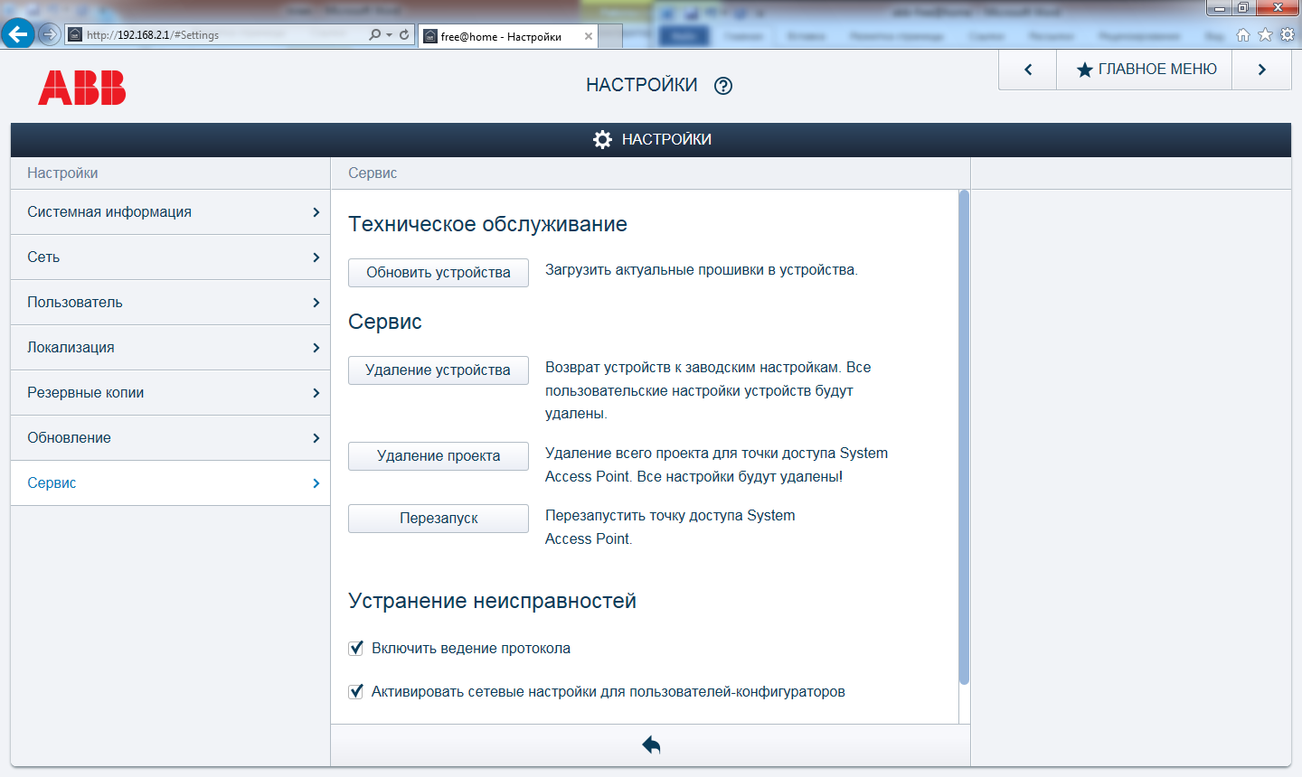 Пункт «Обновление» позволяет загрузить новую версию встроенного программного обеспечения для контроллера из интернета (если есть доступ к нему) или из локального файла. В группе «Сервис» есть аналогичный пункт уже для устройств в сети, а также функции сброса настроек и перезагрузки контроллера.
