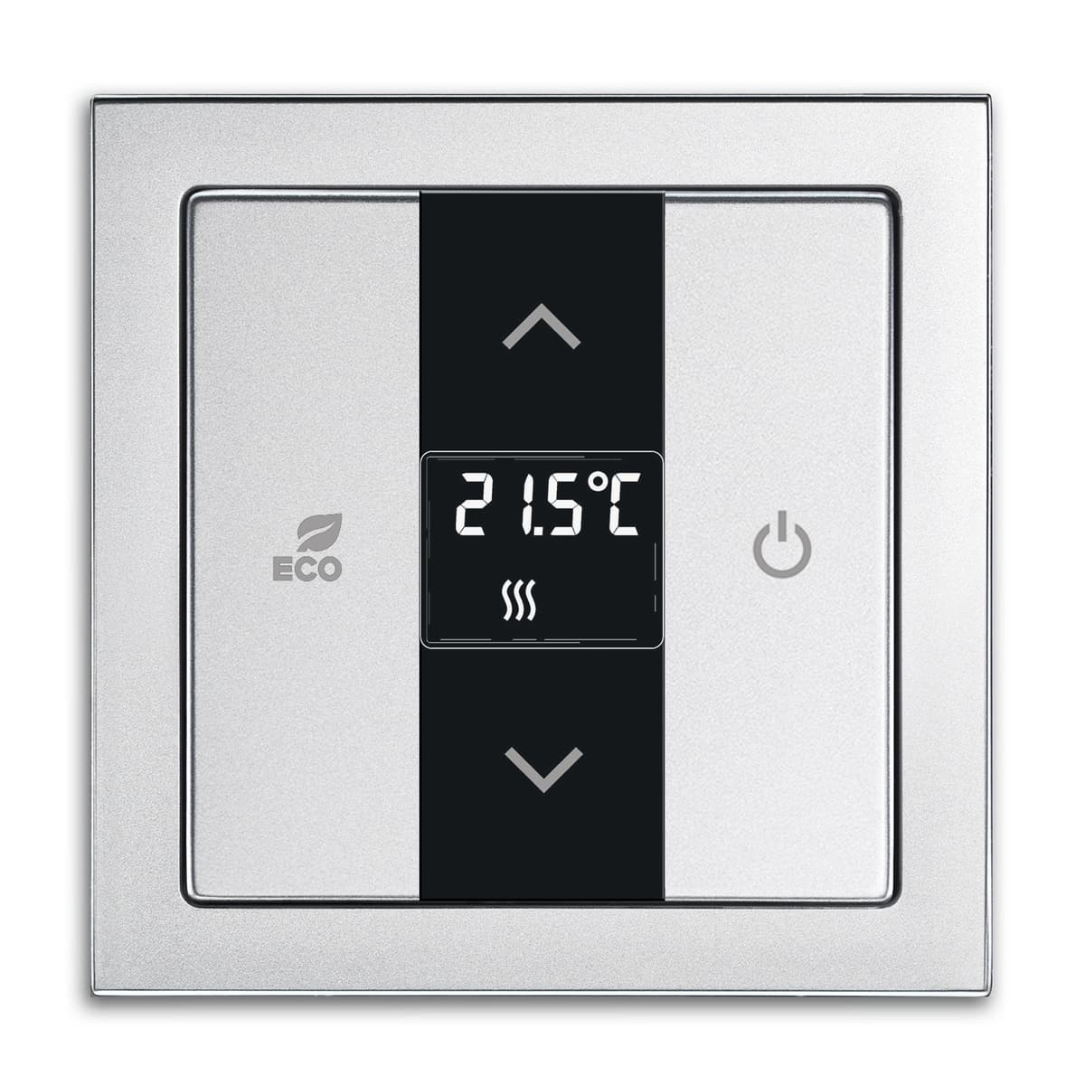 Комнатный термостат RTC-F-1 используется для реализации сценариев поддержания заданной температуры. Как и датчик движения, эта модель имеет оригинальный конструктив, требующий накладок нестандартного формата. Блок устанавливается в традиционный подрозетник и имеет глубину около 16 мм. На внешней части находятся четыре кнопки — две для выбора температуры (с точностью до половины градуса в диапазоне от 7 до 35 °C), одну для включения эко-режима и одну для управления общим питанием. В центре модуля находится сегментный индикатор текущей настройки температуры и состояния устройства, оборудованный подсветкой.
