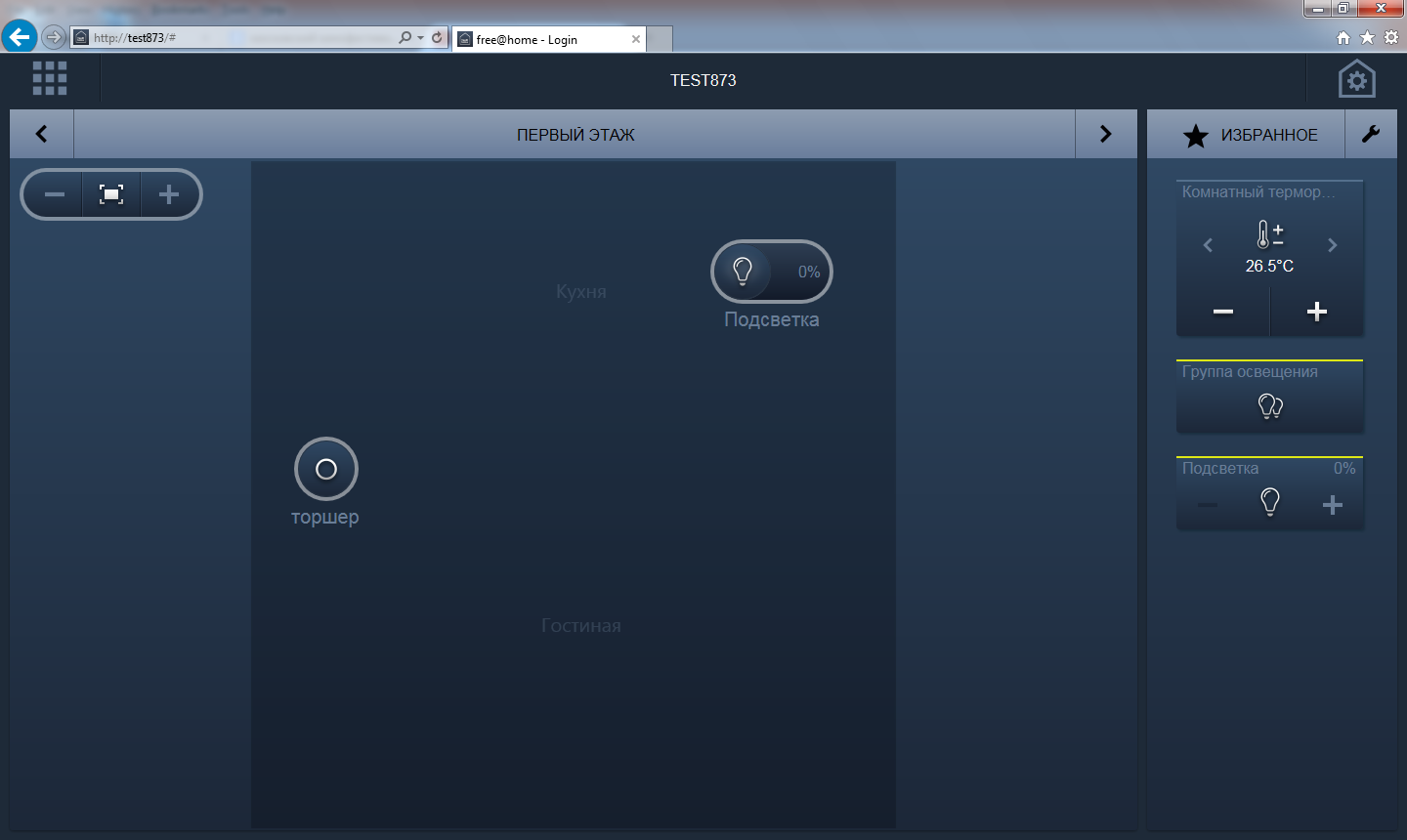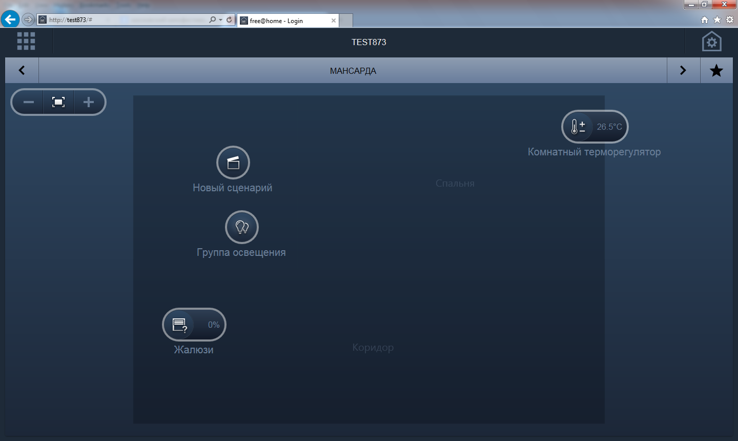 В качестве альтернативных способов контроля предусмотрен доступ через веб-интерфейс в режиме управления. Его основной вариант дизайна страницы повторяет составленную схему размещения элементов на плане дома. Для переключения этажей используются кнопки в верхней части окна.