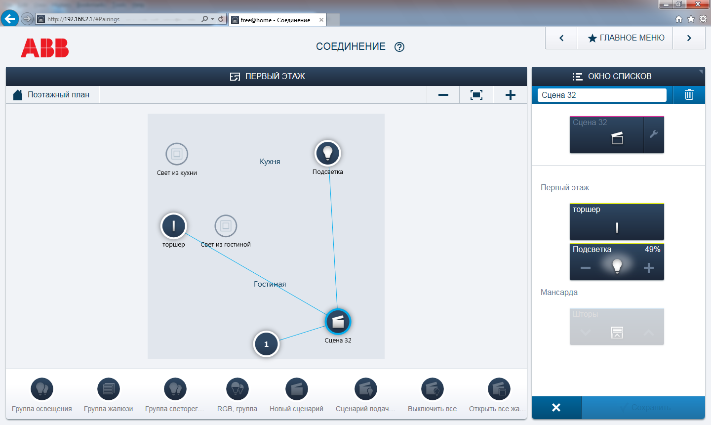 Данная схема позволяет реализовать многостороннее переключение (несколько сенсоров, один исполнительный элемент), групповое переключение (один сенсор, несколько исполнительных блоков), а также работу со сценами (сценариями). Последняя функция реализована через виртуальные устройства. Их также нужно будет разместить на плане помещения, задать участвующие элементы и их состояния при активации сцены. Заметим, что есть возможность использовать в сценариях устройства с разных этажей. Кроме того, в системе предусмотрена работа с группами (например, освещения), которая отличается от сценария возможностью отправки участникам общих команд, например выключения или диммирования, а не только установки в фиксированное состояние.