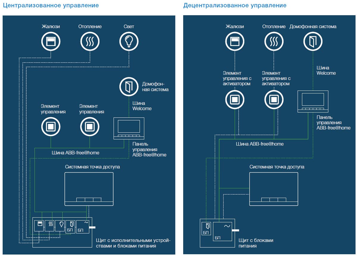 С точки зрения построения системы управления, можно использовать как распределенный вариант, когда исполнительные устройства находятся около соответствующих потребителей, так и централизованный, где все нагрузки коммутируются из общего распределительного шкафа. Конечно, можно и комбинировать данные схемы исходя из требований проекта.