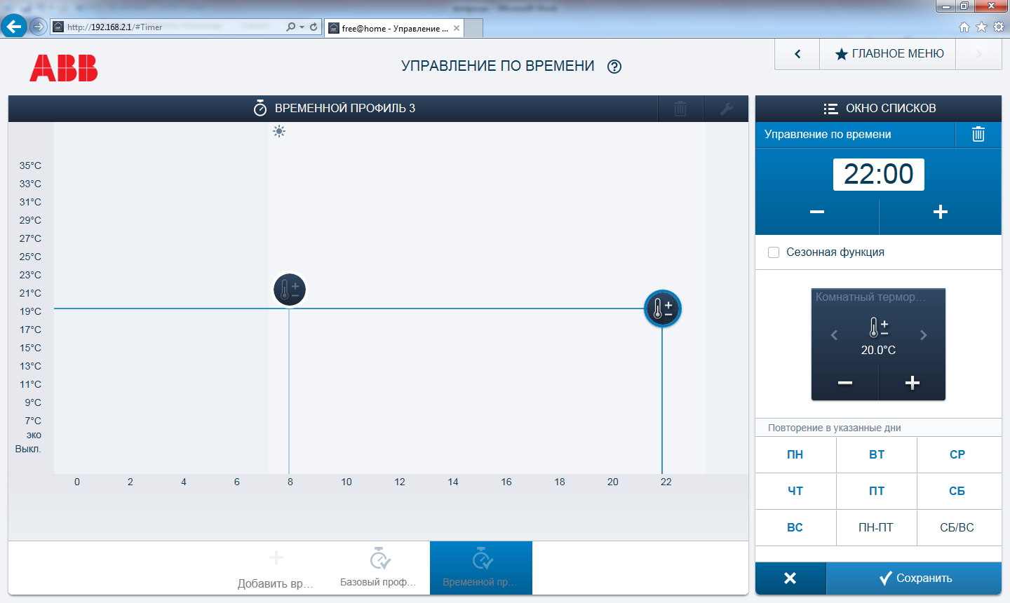 Кроме настраиваемых пользователем профилей, в системе уже запрограммирован базовый астрономический профиль для управления подсветкой светодиодных индикаторов. Также есть специальная реализация профиля присутствия, когда система записывает реальную работу в течение недели и потом позволяет ее проигрывать.