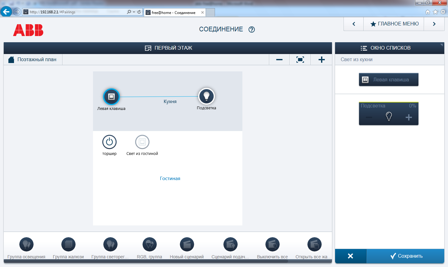 Следующий важный этап — создание связей между сенсорами и исполнительными устройствами. Он также осуществляется в упрощенном визуальном режиме — сначала выбираете клавишу или датчик, а потом реле или диммер. Если в одном блоке установлено две клавиши, то они программируются независимо. Все изменения вступают в работу немедленно, что позволяет оперативно проверять их работоспособность.