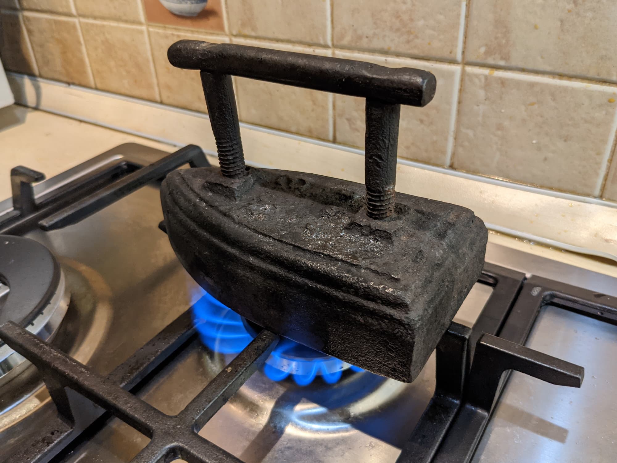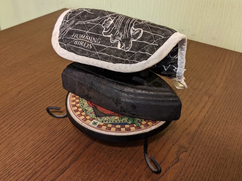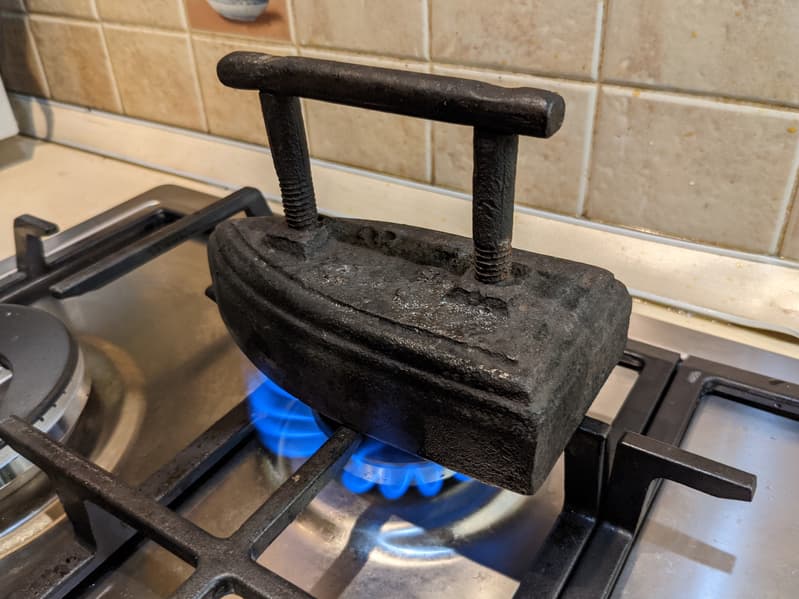 Утюг может нагреваться на газовой или дровяной плите, разогревать его недолго (чуть ниже мы измерим необходимое для этого время). Не рекомендуется использовать для этих целей керосинку с неотрегулированным пламенем — на подошве могут остаться следы, которые потом запачкают белье.