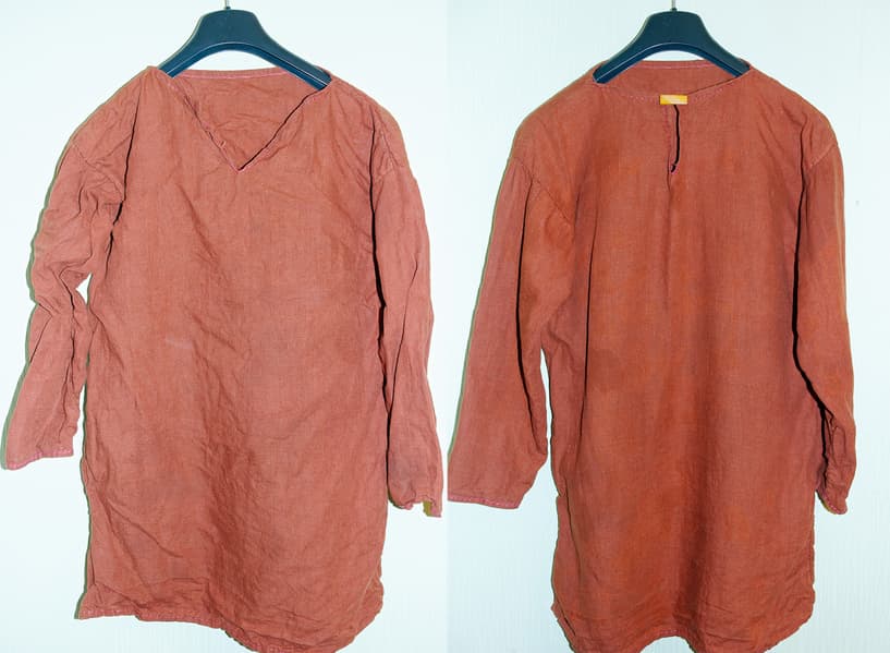 Мужская рубаха из конопляного волокна, окрашенного естественными красителями, также была сильно измята при длительной сушке.