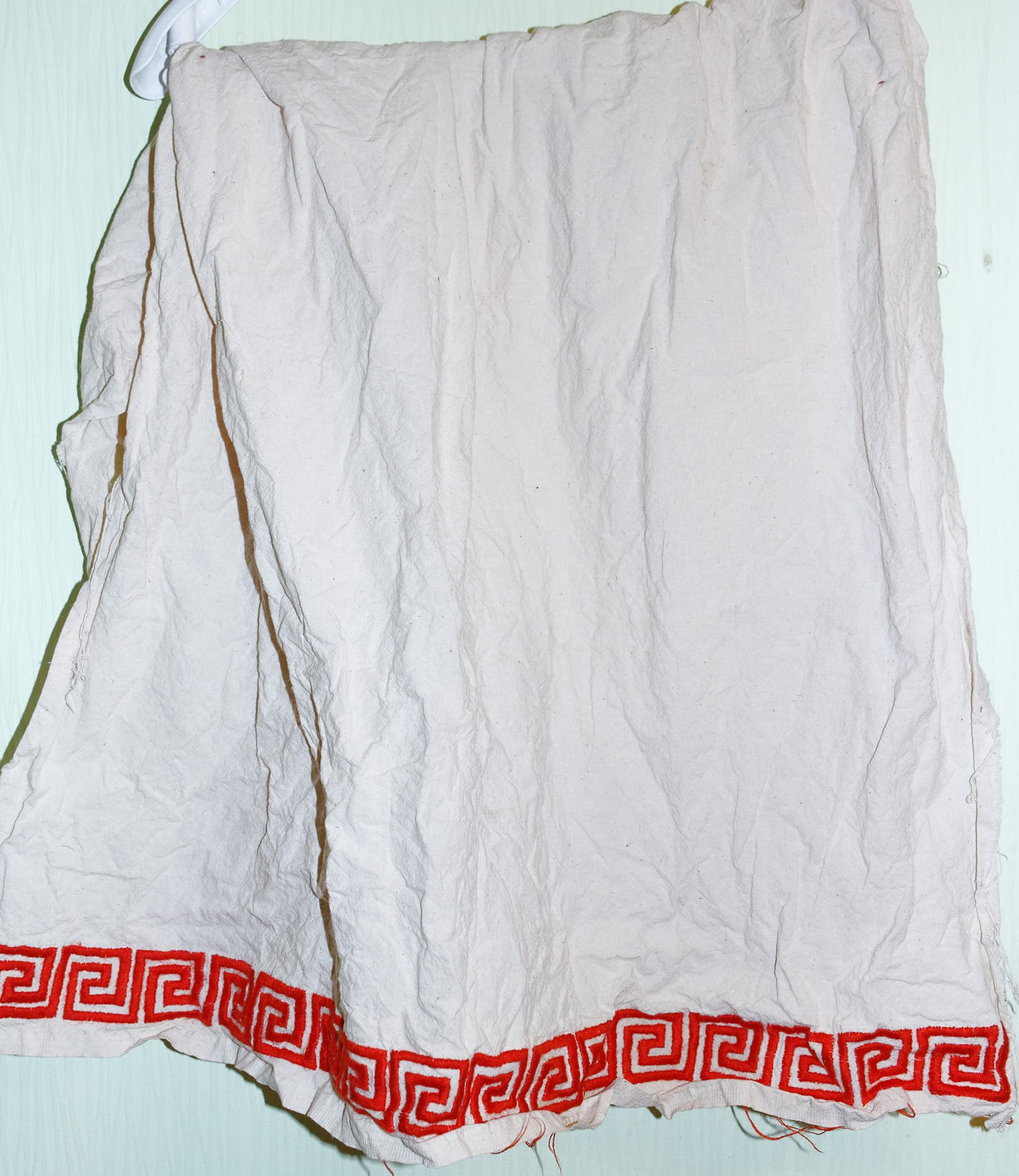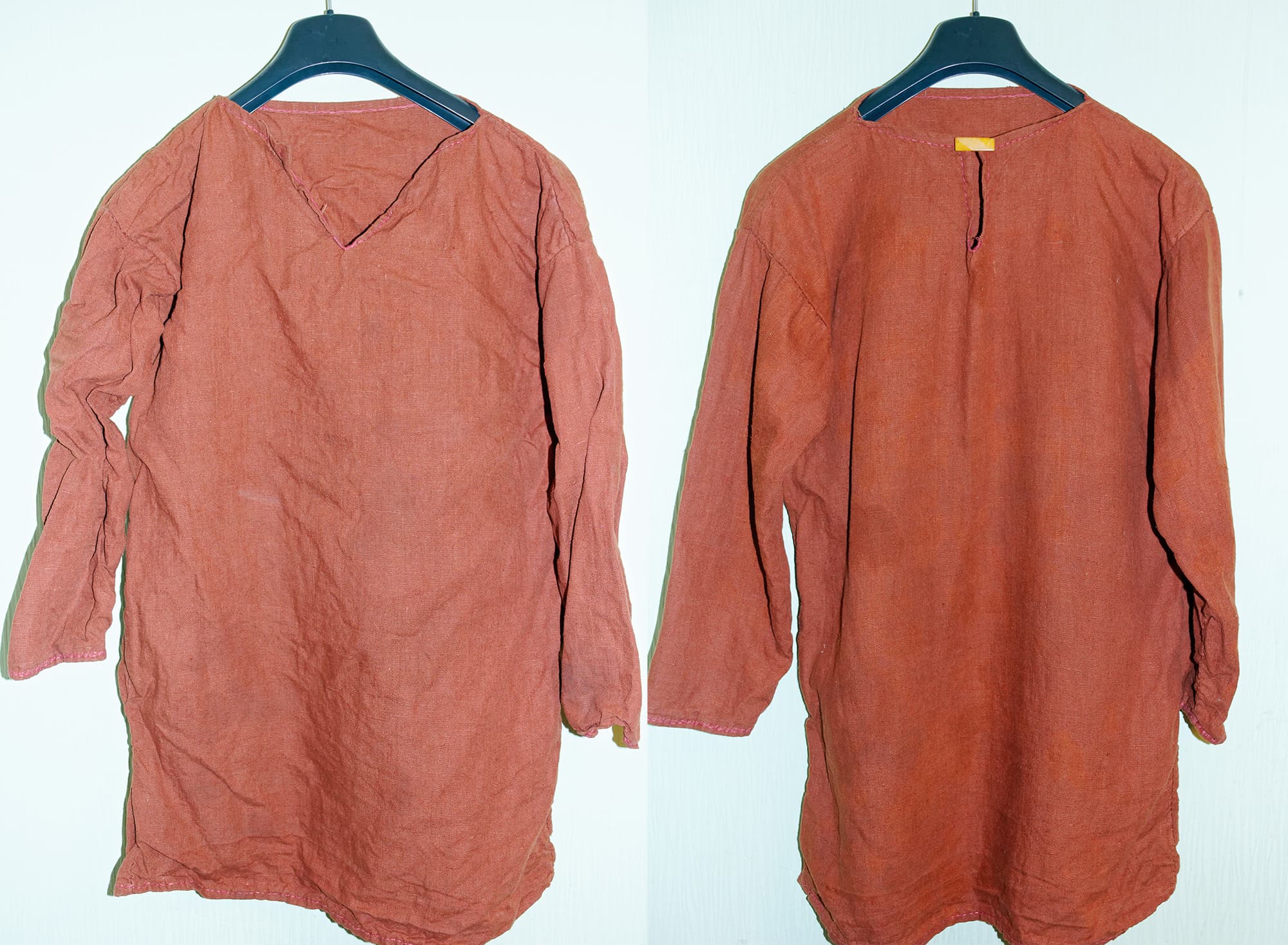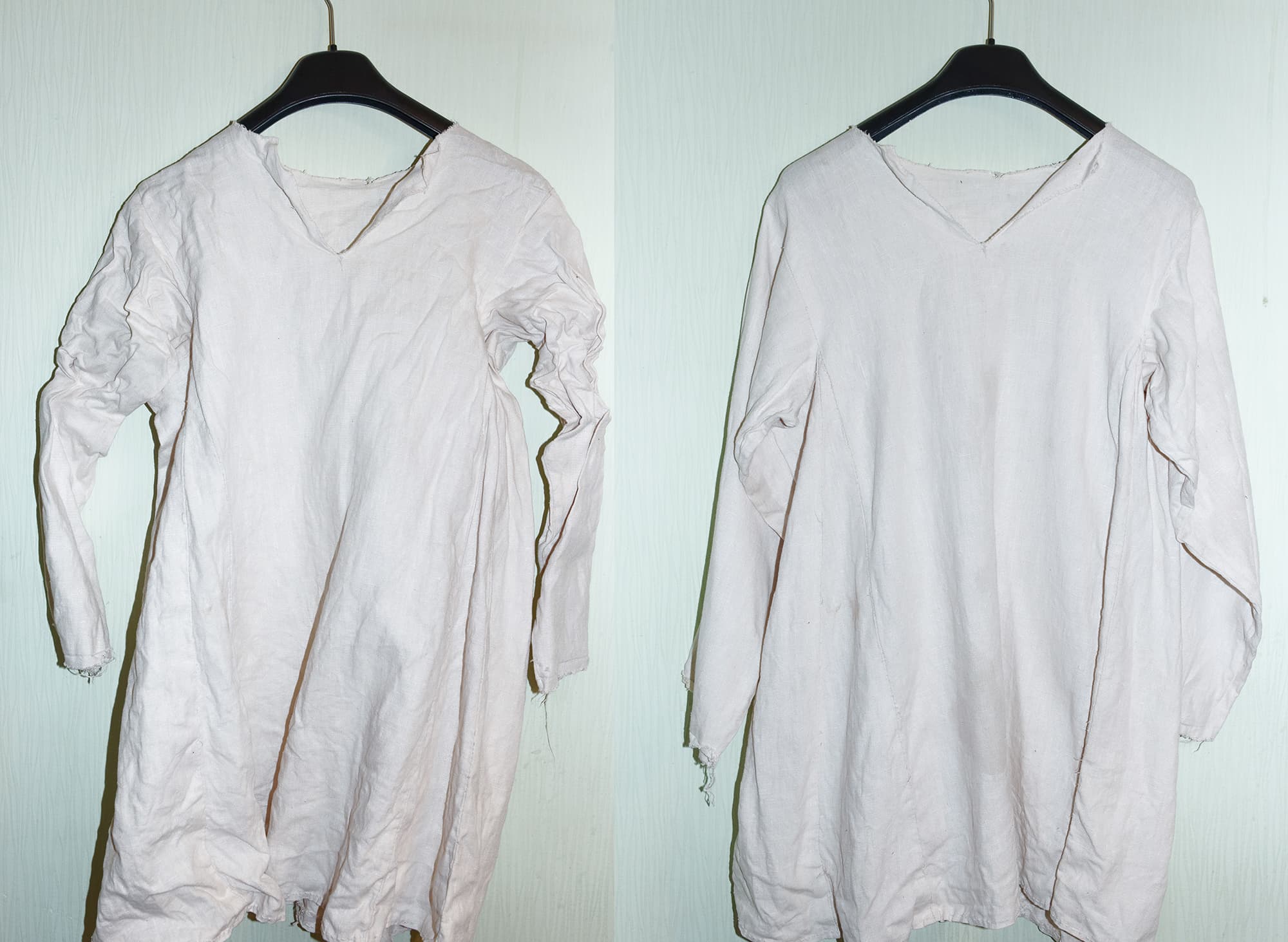 Для первого теста мы взяли нижнюю мужскую рубаху из некрашеного домотканого льна ручного пошива. Одежда была сильно пересушенной при хранении и имела многочисленные складки и заломы.