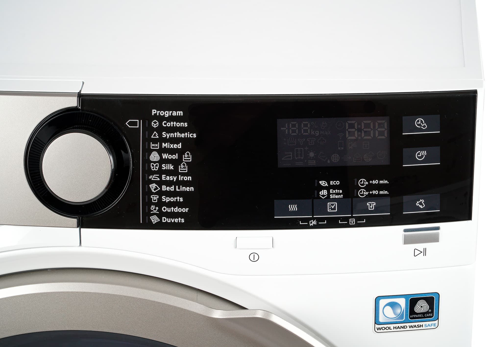 При внимательном взгляде на дисплей можно увидеть, что на нем имеются дополнительные иконки, неактивные при эксплуатации: один и тот же типовой дисплей применяется в нескольких моделях сушильных машин AEG, и некоторые опции в нашей версии сушки отсутствуют. К примеру, в T8DEE48S нет управления со смартфона и обработки паром: эти функции есть, вероятно, у более старших моделей линейки.