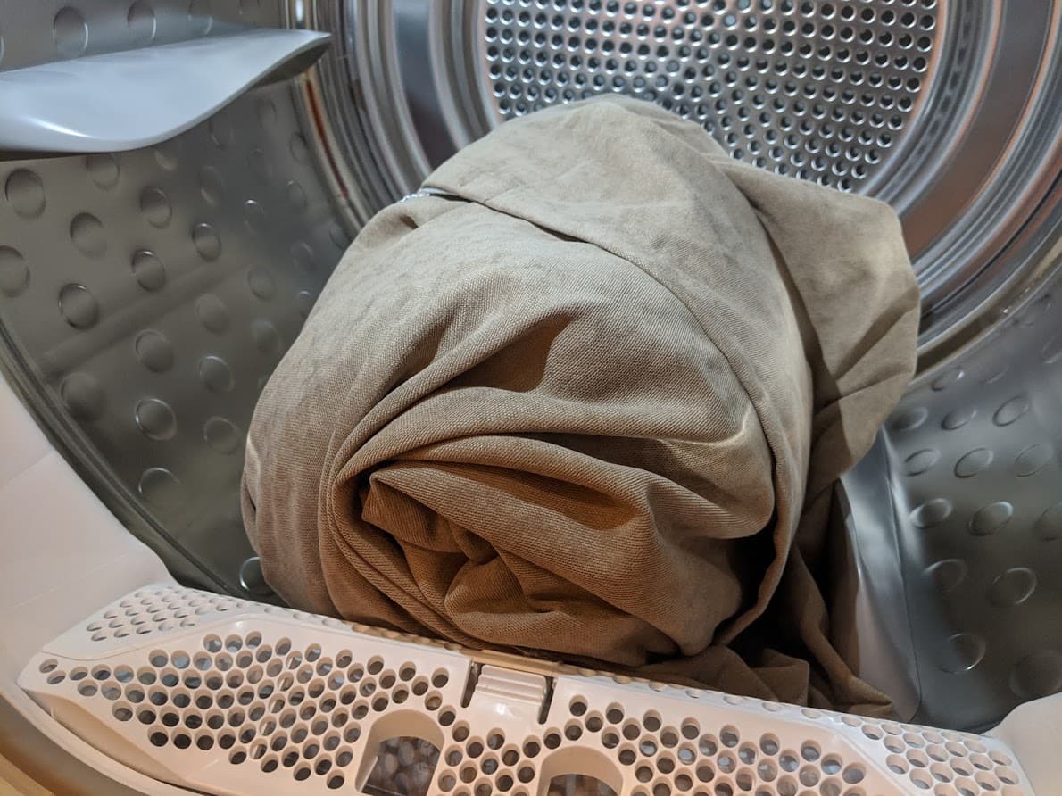 В этом тесте нас интересовало, как сушильная машина справится с большими, но тонкими кусками ткани. Сняв с окон две плотные шторы из смесовой ткани размером примерно 3 на 3 метра и общим весом в 2,7 кг, мы постирали их, отжав при 800 оборотах в минуту, и поместили в сушильный барабан на программе для синтетики.