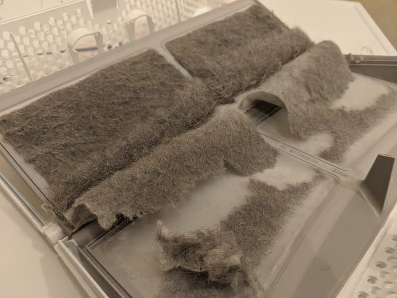 Плед мы слегка прополоскали, отжали на 800 оборотах и поместили в сушку на режиме для одеял. Приблизительно через полтора часа, когда программа завершила свою работу, мы извлекли из устройства воздушный фильтр и остались впечатлены увиденным.