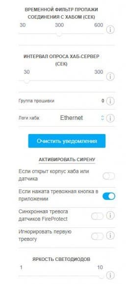 В настройках центрального хаба имеется возможность изменить некоторые сервисные параметры, активировать сотовую связь хаба (если активная сим-карта вставлена в соответствующий слот), включить/выключить Ethernet либо ввести IP-адрес хаба вручную, а также выбрать тип уведомлений, которые должны отправляться пользователю.