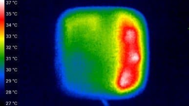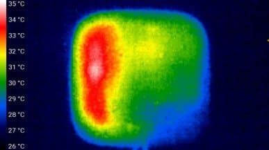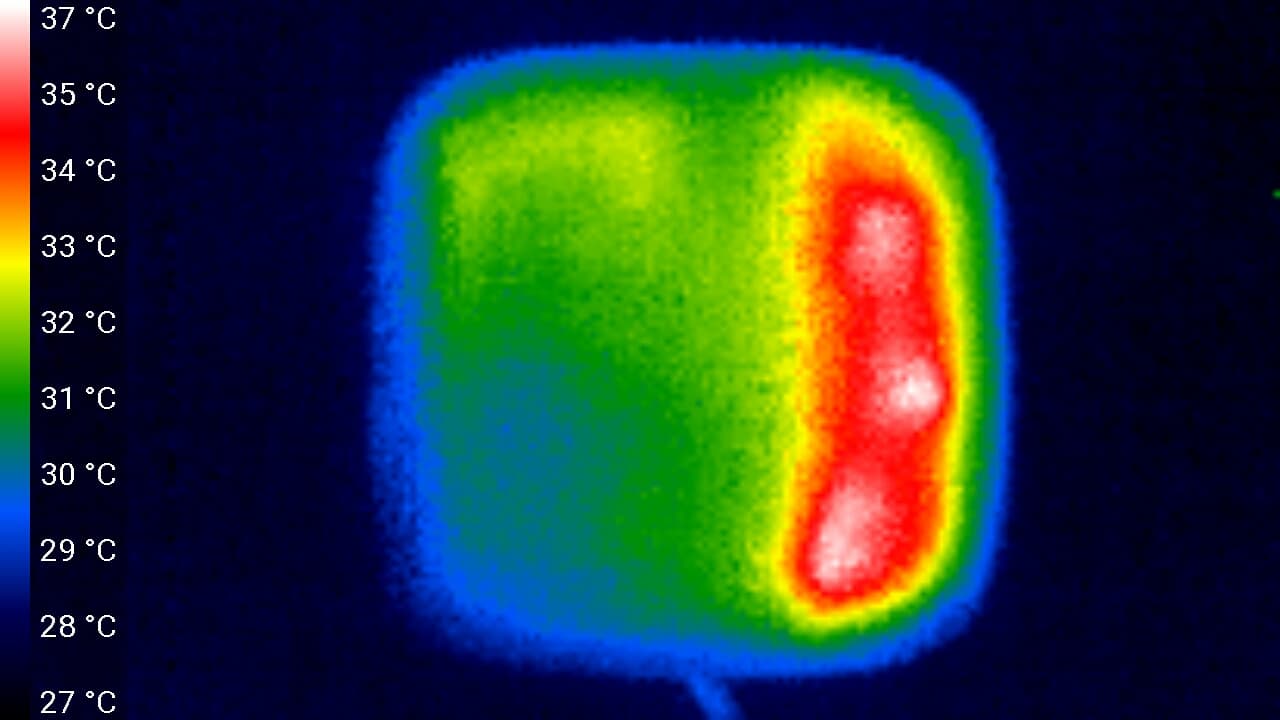 Во время длительной работы устройство нагревается совсем незначительно, наибольший нагрев происходит в области блока, отвечающего за питание от сети переменного тока — ну это само собой. Следующие теплоснимки сделаны после нескольких суток работы хаба в комнате с температурой около 25 °C. Можно видеть, что максимальная температура корпуса в некоторых его участках достигла лишь 37 °C, что совершенно безопасно для любых поверхностей, на которых может быть закреплен хаб.
