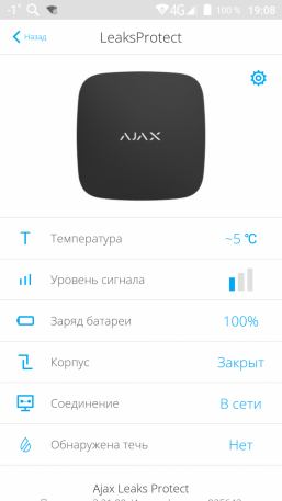 Как видим, никаких расхождений не имеется, в обоих случаях датчик протечки сообщает об отсутствии воды и о том, что температура окружающего воздуха составляет 5 °C. Обратите внимание на уровень сигнала, который занимает всего одно деление шкалы из трех возможных. Да, в данный момент именно этот датчик находится на значительном удалении от хаба и вообще в другом здании (раскроем секрет: это баня), причем хаб и датчик разделяет множество физических препятствий (стены, крыши и т. д.) из самых разных материалов, от кирпича и дерева до стекла и металла.