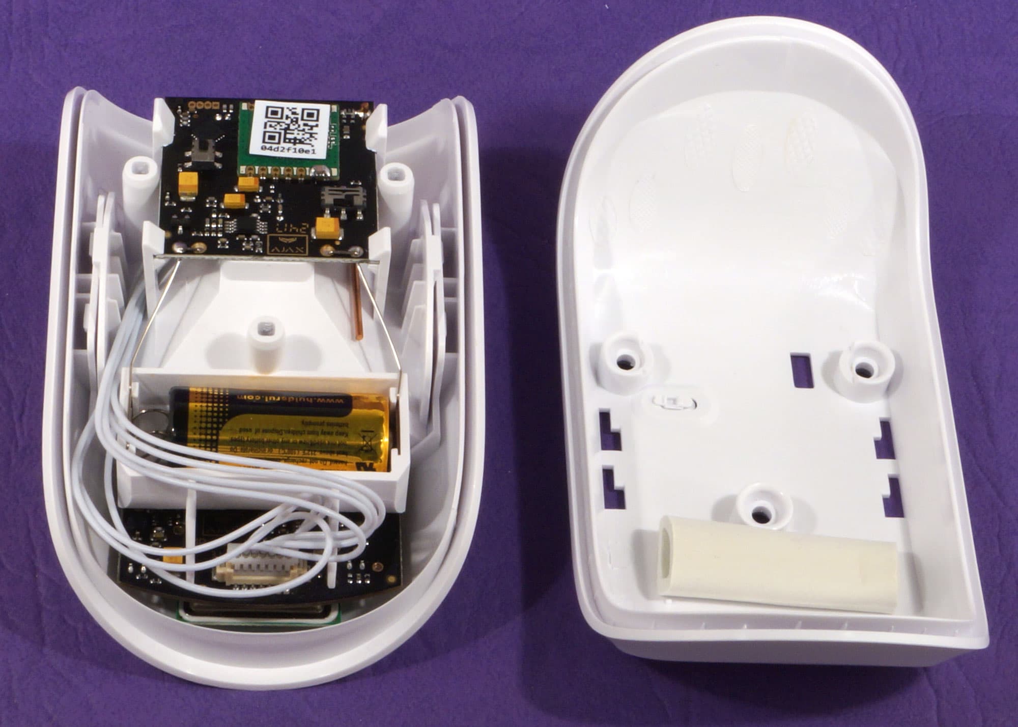 Внутренняя конструкция устройств однотипна: элемент питания, управляющая электроника на плате, антенна. Различия же определяются наличием тех или иных сенсоров. Основой каждого устройства служит пироэлектрический инфракрасный (PIR) датчик движения, который одинаков во всех трех моделях. На этом похожесть устройств заканчивается. Самым простым устройством в линейке можно назвать Ajax MotionProtect. Он оснащен единственным пиросенсором, регистрирующим движение. Во второй модели, Ajax MotionProtect Plus, в дополнение к пиросенсору, присутствует микроволновый сенсор, который отфильтровывает случайные источники тревоги, тем самым делая работу основного пиросенсора более точной. Наконец, в модели Ajax CombiProtect имеется не только пиросенсор, но еще и чувствительный электретный микрофон, улавливающий звук. Программная логика, обрабатывающая звуковой поток, настроена на частоту, которую обычно издает бьющееся стекло. Таким образом, если в зоне действия датчика кто-то разобьет окно (нет, лучше бокал — на счастье), то центральный хаб получит соответствующее оповещение и включит режим тревоги.