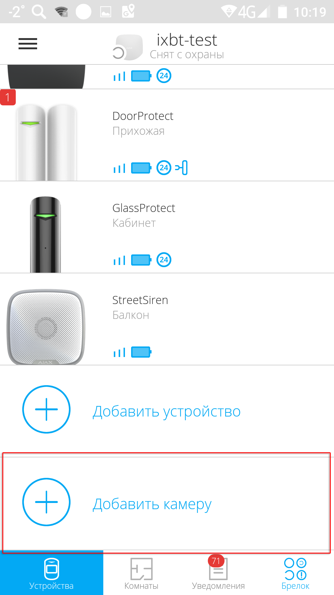 Ранее мы упоминали об отличиях в функциональности мобильного приложения и уходящей из эксплуатации веб-формы облачного сервиса. С виду незначительный, этот фактор может оказаться крайне важным в эксплуатации. Дело в том, что в мобильном приложении, в отличие от веб-формы облачного сервиса, к нашей охранной системе (а конкретнее — к хабу) можно подключить еще один тип устройств: IP камеру. В браузере же это сделать нельзя.